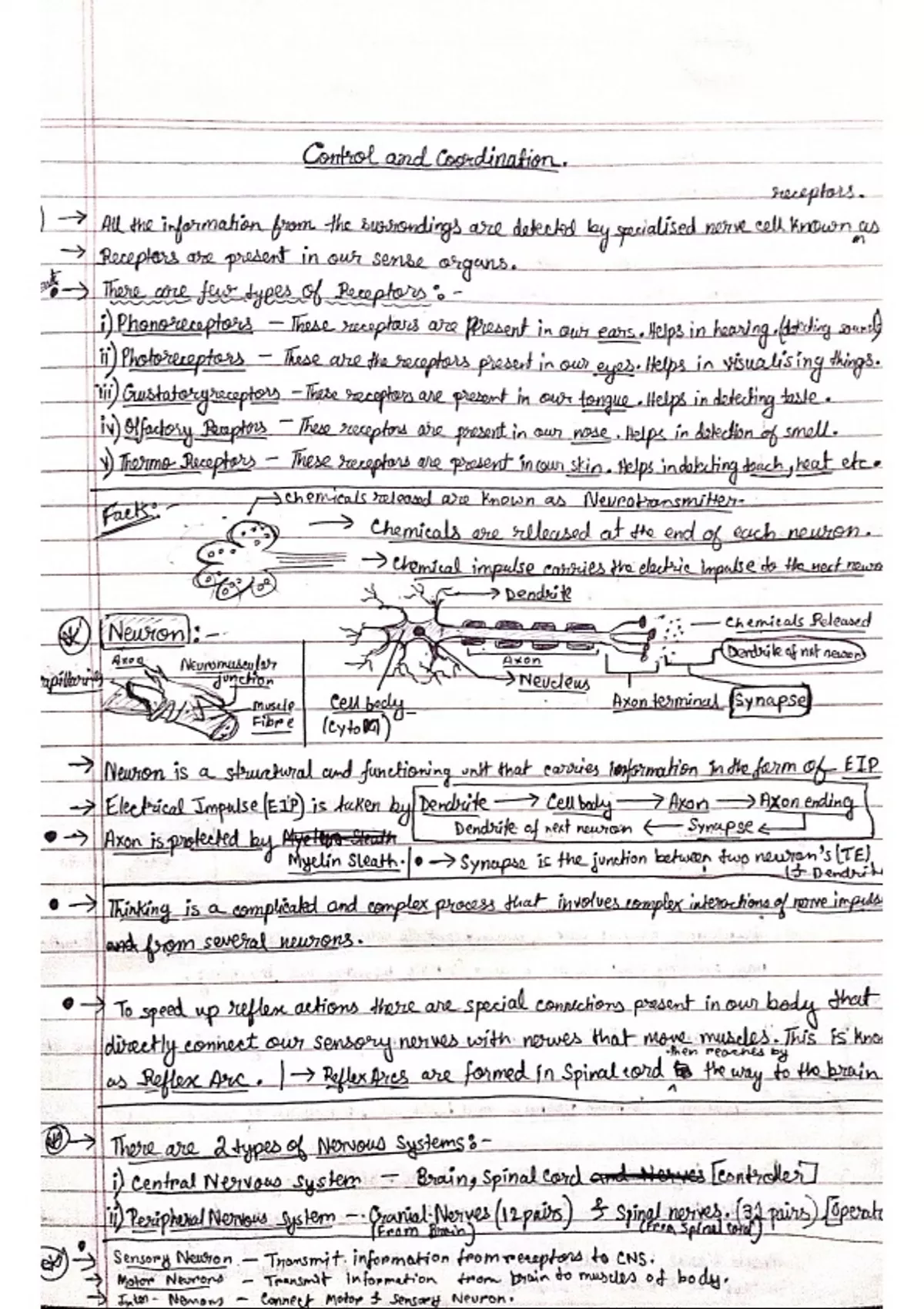 CONTROL AND CO-ORDINATION Class 8-10 handwritten notes to ace your examination