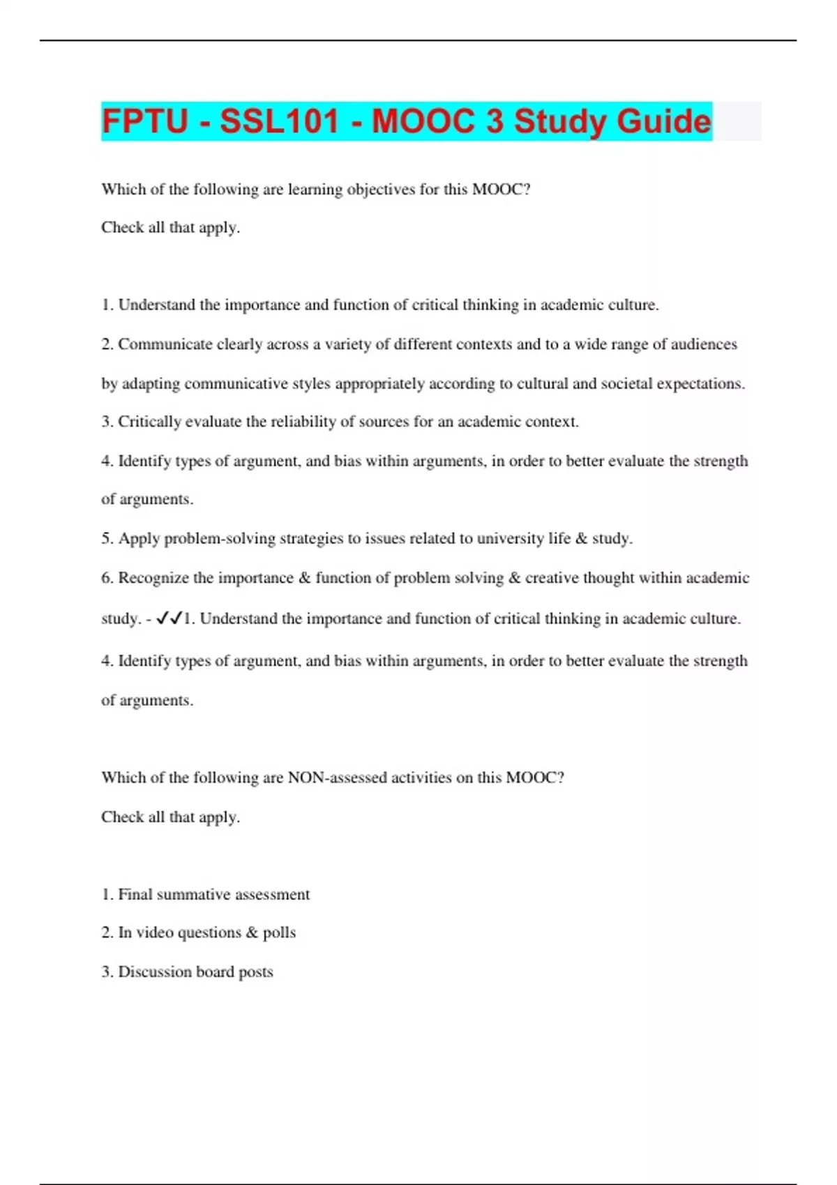 FPTU - SSL101 - MOOC 3 Study Guide | 100 Questions with 100% Correct Answers | Updated & Verified