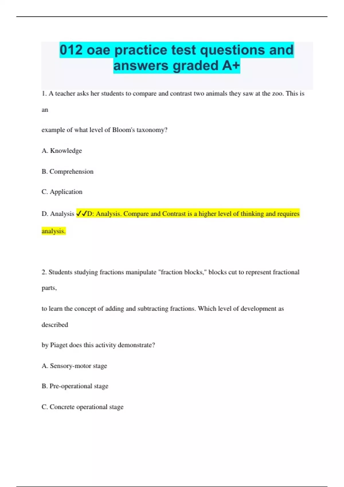 012 oae practice test questions and answers graded A+ 1. A teacher asks her students to compare and contrast two animals they saw at the zoo. This is an example of what level of Bloom's taxonomy? A. Knowledge B. Comprehension C. Application D. Analysis D: Analysis. Compare and Contrast is a higher level of thinking and requires analysis. 2. Students studying fractions manipulate "fraction blocks," blocks cut to represent fractional parts, to learn the concept of adding and subtracting fractions. Which level of development as described by Piaget does this activity demonstrate? A. Sensory-motor stage B. Pre-operational stage C. Concrete operational stage D. Formal operations stage C: Concrete operational stage. The manipulation of objects in the learning process involves using concrete materials to bridge understanding of abstract concepts. 3. According to Kohlberg, at which developmental level do children understand that good behavior is expected? A. Post-Conventional B. Conventional C. Pre-Conventional D. Adolescent B: Conventional. There is actually a hint to this answer in its name. According to Kohlberg, the stage of development during which children learn conventional behavior—e.g., good behavior—is the Conventional Stage 4. Erikson's stages of development include all of the following except A. Young childhood B. Middle adulthood C. Adolescence D. Late childhood D: Late childhood. This is not one of Erikson's levels of development. 5. In Bronfenbrenner's organization of child development, the family or classroom is considered a A. Chronosystem B. Microsystem C. Macrosystem D. Mesosystem B: Microsystem. The family unit and the classroom unit constitute a small social system, a microsystem. 6. One of Vygotsky's major contributions to the field of early childhood development is the concept of A. Punishment/obedience B. A taxonomy of learning skill levels C. The importance of play as a learning activity