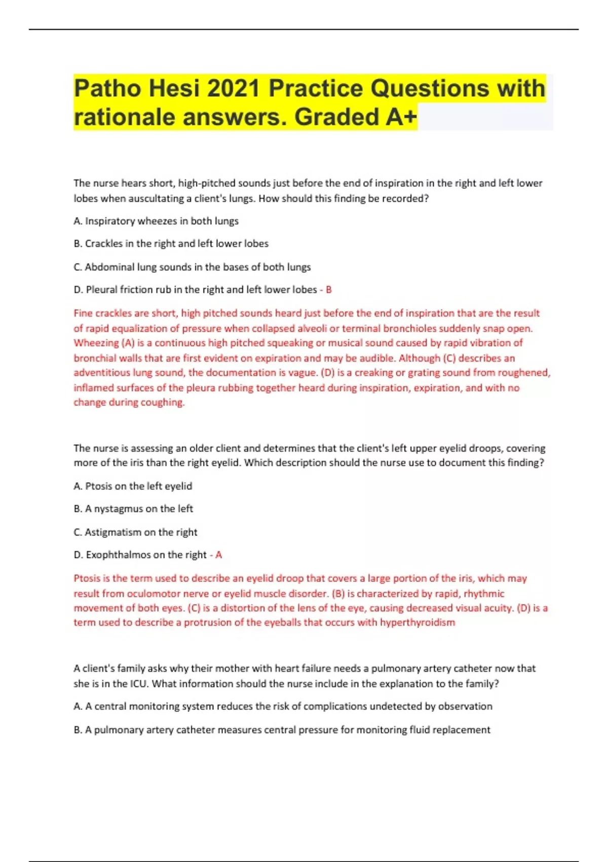 Patho Hesi 2021 Practice Questions with rationale answers. Graded A+ Document Content and Description Below The nurse hears short, high-pitched sounds just before the end of inspiration in the right and left lower lobes when auscultating a client's lungs. How should this finding be recorded? A. Inspiratory wheezes in both lungs B. Crackles in the right and left lower lobes C. Abdominal lung sounds in the bases of both lungs D. Pleural friction rub in the right and left lower lobes - B Fine crackles are short, high pitched sounds heard just before the end of inspiration that are the result of rapid equalization of pressure when collapsed alveoli or terminal bronchioles suddenly snap open. Wheezing (A) is a continuous high pitched squeaking or musical sound caused by rapid vibration of bronchial walls that are first evident on expiration and may be audible. Although (C) describes an adventitious lung sound, the documentation is vague. (D) is a creaking or grating sound from roughened, inflamed surfaces of the pleura rubbing together heard during inspiration, expiration, and with no change during coughing. The nurse is assessing an older client and determines that the client's left upper eyelid droops, covering more of the iris than the right eyelid. Which description should the nurse use to document this finding? A. Ptosis on the left eyelid B. A nystagmus on the left C. Astigmatism on the right D. Exophthalmos on the right - A Ptosis is the term used to describe an eyelid droop that covers a large portion of the iris, which may result from oculomotor nerve or eyelid muscle disorder. (B) is characterized by rapid, rhythmic movement of both eyes. (C) is a distortion of the lens of the eye, causing decreased visual acuity. (D) is a term used to describe a protrusion of the eyeballs that occurs with hyperthyroidism A client's family asks why their mother with heart failure needs a pulmonary artery catheter now that she is in the ICU. What information should the nurse include in the explanation to the family? A. A central monitoring system reduces the risk of complications undetected by observation B. A pulmonary artery catheter measures central pressure for monitoring fluid replacement C. Pulmonary artery catheters allow for early detection of lung problems D. The healthcare provider should explain the many reasons for its use. - B Pulmonary artery catheters are used to measure central pressures and fluid balance. Even though all clients in the ICU require close monitoring, they do not all need a PA catheter (A). PA lines do not detect pulmonary problems (C). (D) avoids the family's question. Several hours after surgical repair of an abdominal aortic aneurysm, the client develops left flank pain. The nurse determines the client's urinary output is 20 mL/hr for the past 2 hours. The nurse should conclude that these findings support which complication? A. Infection B. Hypovolemia C. Intestinal ischemia D. Renal artery embolization - D Postoperative complications of surgical repair of AAA are related to the location of resection, graft, or stent placement along the abdominal aorta. Embolization of a fragment of thrombus or plaque from the aorta into a renal artery can compromise blood flow in one of the renal arteries, resulting in renal ischemia that precipitates unilateral flank pain. Intraoperative blood loss or rupture of the aorta anastomosis can cause acute renal failure related to hypovolemia (B), which involves both kidneys and causing bilateral flank pain. (A) and (C) are not associated with these symptoms The nurse is assessing a postmenopausal woman who is complaining of urinary urgency and frequency and stress incontinence. She also reports difficulty emptying her bladder. These complaints are most likely due to which condition? A. Cystocele B. Bladder infection C. Pyelonephritis D. Irritable bladder - A This constellation of signs in a postmenopausal woman are characteristic of cystocele. These symptoms are not characteristic of (B), (C), or (D) A male client who has never smoked by has had COPD is now being assessed for cancer of the lung. The nurse knows that he is most likely to develop which type of lung cancer? A. Adenocarcinoma B. Oat-cell carcinoma C. Malignant melanoma D. Squamous cell carcinoma - A Adenocarcinoma is the only lung cancer not related to cigarette smoking. It has been found to be directly related to lung scarring and fibrosis from preexisting pulmonary disease such as TB or COPD. Both (B) and (D) are malignant lung cancers related to cigarette smoking. (C) is a skin cancer and is related to sunlight, not to lung problems Muscular Dystrophy is characterized by which pathophysiological condition? A. Stressed induced tremor and trembling B. Cardiac damage C. Seizure activity D. Skeletal muscle degeneration - D Skeletal muscle degeneration is a classic symptom of muscular dystrophy. Tremors and trembling (A) of hands, particularly when stressed are symptoms of Parkinson's. Cardiac damage (B) and seizures (C) are not exclusive to muscular dystrophy The nurse is preparing to administer atropine, an anticholinergic, to a client who is scheduled for a cholecystectomy. The client asks the nurse to explain the reason for the prescribed medication. What is the best response for the nurse to provide? A. Provide a more rapid induction of anesthesia B. Decrease the risk of bradycardia during surgery C. Induce relaxation before induction of anesthesia D. Minimize the amount of analgesia needed postoperatively - B Atropine may be prescribed to increase the automaticity of the SA node and prevent a dangerous reduction in HR during surgical anesthesia. (A), (C), and (D) do not address the therapeutic action of atropine use perioperatively What information should the nurse include in a teaching plan about the onset of menopause? A. Smoking B. Oophorectomy and histerectomy C. Early menarche D. Cardiac disease E. Genetic influence F. Chemotherapy exposure - A, B, C, E, and F Menop