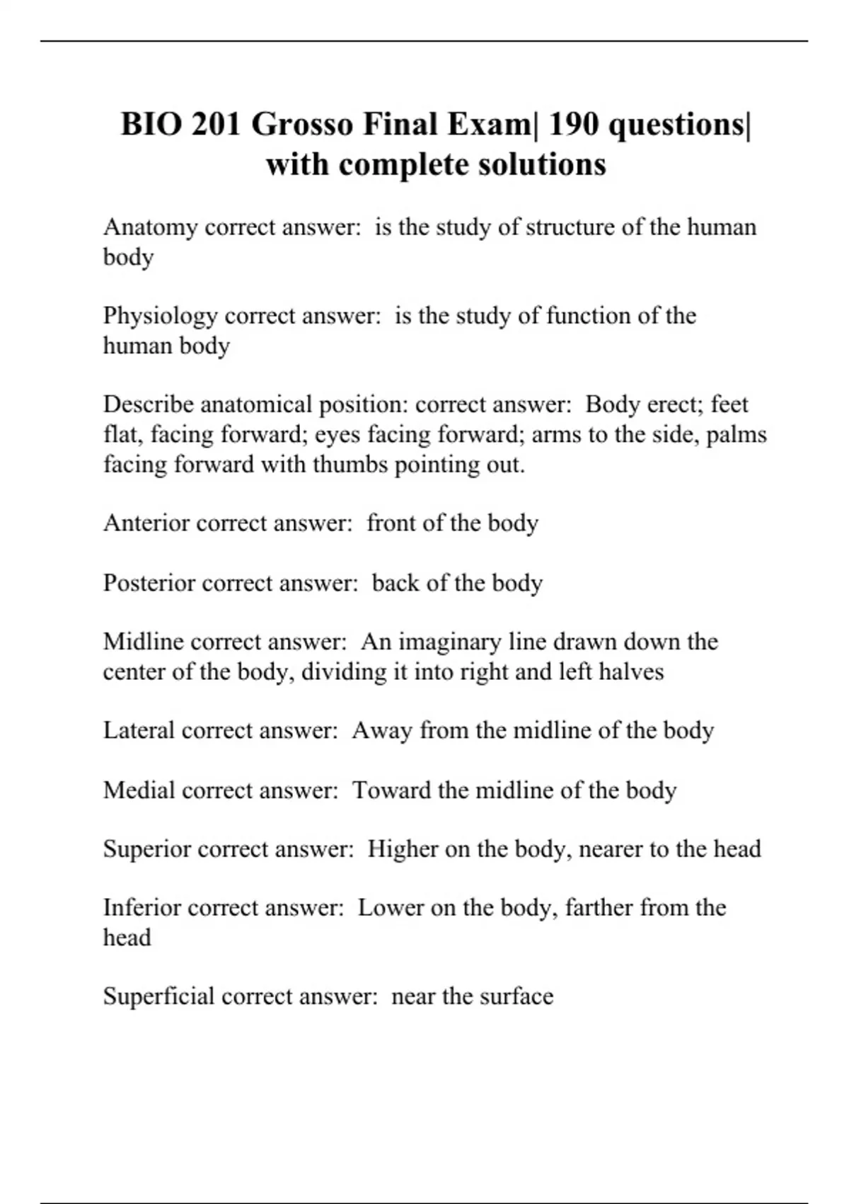 BIO 201 Grosso Final Exam| 190 questions| with complete solutions