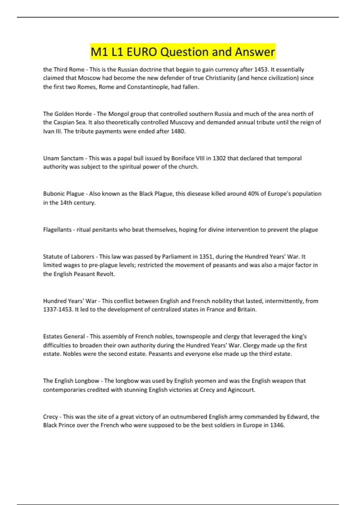 the Third Rome - This is the Russian doctrine that begain to gain currency after 1453. It essentially claimed that Moscow had become the new defender of true Christianity (and hence civilization) since the first two Romes, Rome and Constantinople, had fallen. The Golden Horde - The Mongol group that controlled southern Russia and much of the area north of the Caspian Sea. It also theoretically controlled Muscovy and demanded annual tribute until the reign of Ivan III. The tribute payments were ended after 1480. Unam Sanctam - This was a papal bull issued by Boniface VIII in 1302 that declared that temporal authority was subject to the spiritual power of the church. Bubonic Plague - Also known as the Black Plague, this diesease killed around 40% of Europe's population in the 14th century. Flagellants - ritual penitants who beat themselves, hoping for divine intervention to prevent the plague Statute of Laborers - This law was passed by Parliament in 1351, during the Hundred Years' War. It limited wages to pre-plague levels; restricted the movement of peasants and was also a major factor in the English Peasant Revolt. Hundred Years' War - This conflict between English and French nobility that lasted, intermittently, from . It led to the development of centralized states in France and Britain. Estates General - This assembly of French nobles, townspeople and clergy that leveraged the king's difficulties to broaden their own authority during the Hundred Years' War. Clergy made up the first estate. Nobles were the second estate. Peasants and everyone else made up the third estate. The English Longbow - The longbow was used by English yeomen and was the English weapon that contemporaries credited with stunning English victories at Crecy and Agincourt. Crecy - This was the site of a great victory of an outnumbered English army commanded by Edward, the Black Prince over the French who were supposed to be the best soldiers in Europe in 1346. Jacquerie - This French peasant revolt during and after 1358 was the result of the heavy taxation and suffering inflicted on French peasants during the Hundred Years' War. It was brutally repressed by French knights. John Ball and Wat Tyler - These men led the English peasant revolts in 1381. Ball was an English Lollard priest. Tyler led a force to Canterbury to protest atrocities associated with the collection of a poll tax. Both were killed during the revolt. Agincourt 1419 - This was thelast of the great victories of the English long bowmen over French chivalry. It was the result of poor French leadership and advantageous use of terrain by the English army. It nearly led to the unification of France and Britain under Henry V. Joan of Arc - Also, known as the Maid of Orleans. This young French girl claimed that God had sent her on a mission to lead French forces against the English during the Hundred Years' War. She helped the French to break the siege of Orleans but was later betrayed, tried for heresy and executed by the English.