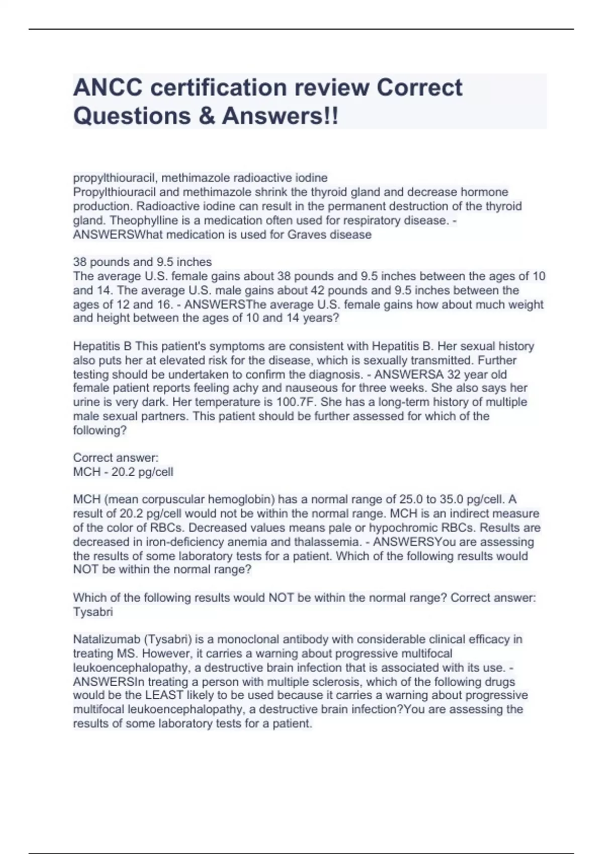 propylthiouracil, methimazole radioactive iodine Propylthiouracil and methimazole shrink the thyroid gland and decrease hormone production. Radioactive iodine can result in the permanent destruction of the thyroid gland. Theophylline is a medication often used for respiratory disease. - ANSWERSWhat medication is used for Graves disease 38 pounds and 9.5 inches The average U.S. female gains about 38 pounds and 9.5 inches between the ages of 10 and 14. The average U.S. male gains about 42 pounds and 9.5 inches between the ages of 12 and 16. - ANSWERSThe average U.S. female gains how about much weight and height between the ages of 10 and 14 years? Hepatitis B This patient's symptoms are consistent with Hepatitis B. Her sexual history also puts her at elevated risk for the disease, which is sexually transmitted. Further testing should be undertaken to confirm the diagnosis. - ANSWERSA 32 year old female patient reports feeling achy and nauseous for three weeks. She also says her urine is very dark. Her temperature is 100.7F. She has a long-term history of multiple male sexual partners. This patient should be further assessed for which of the following? Correct answer: MCH - 20.2 pg/cell MCH (mean corpuscular hemoglobin) has a normal range of 25.0 to 35.0 pg/cell. A result of 20.2 pg/cell would not be within the normal range. MCH is an indirect measure of the color of RBCs. Decreased values means pale or hypochromic RBCs. Results are decreased in iron-deficiency anemia and thalassemia. - ANSWERSYou are assessing the results of some laboratory tests for a patient. Which of the following results would NOT be within the normal range? Which of the following results would NOT be within the normal range? Correct answer: Tysabri Natalizumab (Tysabri) is a monoclo