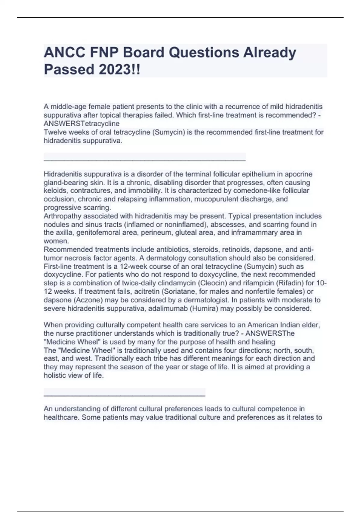A middle-age female patient presents to the clinic with a recurrence of mild hidradenitis suppurativa after topical therapies failed. Which first-line treatment is recommended? - ANSWERSTetracycline Twelve weeks of oral tetracycline (Sumycin) is the recommended first-line treatment for hidradenitis suppurativa. __________________________________________________ Hidradenitis suppurativa is a disorder of the terminal follicular epithelium in apocrine gland-bearing skin. It is a chronic, disabling disorder that progresses, often causing keloids, contractures, and immobility. It is characterized by comedone-like follicular occlusion, chronic and relapsing inflammation, mucopurulent discharge, and progressive scarring. Arthropathy associated with hidradenitis may be present. Typical presentation includes nodules and sinus tracts (inflamed or noninflamed), abscesses, and scarring found in the axilla, genitofemoral area, perineum, gluteal area, and inframammary area in women. Recommended treatments include antibiotics, steroids, retinoids, dapsone, and anti-tumor necrosis factor agents. A dermatology consultation should also be considered. First-line treatment is a 12 week course of an oral tetracycline (Sumycin) such as doxycycline. For patients who do not respond to doxycycline, the next recommended step is a combination of twice-daily clindamycin (Cleocin) and rifampicin (Rifadin) for 10-12 weeks. If treatment fails, acitretin (Soriatane, for males and nonfertile females) or dapsone (Aczone) may be considered by a dermatologist. In patients with moderate to severe hidradenitis suppurativa, adalimumab (Humira) may possibly be considered. When providing culturally competent health care services to an American Indian elder, the nurse practitioner understands which is traditionally true? - ANSWERSThe "Medicine Wheel" is used by many for the purpose of health and healing The "Medicine Wheel" is traditionally used and contains four directions; north, south, east, and west. Traditionally each tribe has different meanings for each direction and they may represent the season of the year or stage of life. It is aimed at providing a holistic view of life. ________________________________________ An understanding of different cultural preferences leads to cultural competence in healthcare. Some patients may value traditional culture and preferences as it relates to healthcare. These individual preferences should be included in the interview and treatment plan for patients. Traditionally, the American Indian culture values a holistic approach to health care integrating the person, lifestyle, environment, family, and religion. Patients adhering to these traditional cultural practices often feel that illness is due to a lack of harmony with the physical body, mind, spirit, and emotions. Patients may seek care from western medicine for specific ailments while also consulting with traditional healers for spiritual guidance. Healthcare providers should seek to understand relevant cultural factors and assess each individual's healthcare literacy in order to provide culturally competent care. The nurse practitioner sees an older adult patient in the clinic with the primary report of hearing loss and a sensation of fullness in the right ear. The nurse practitioner suspects conductive hearing loss. Which could contribute to this? - ANSWERSCerumen, commonly called earwax, is a combination of secretions and sloughed epithelial cells that protects the ears from infection, water, and insects. It is normally expelled from the ear canal through natural jaw movement. When this self-cleaning process fails, cerumen can become impacted. Cerumen impaction occludes the ear canal and can press against the tympanic membrane, resulting in conductive hearing loss. _________________________________________ Conductive hearing is the transition of sound from the external and middle ear to the inner ear. Conductive hearing loss is caused by problems in the external and middle ear that interfere with the transmission of sound and its conversion to mechanical vibration. Causes of conductive hearing loss include obstruction of the external auditory canal by cerumen, foreign bodies, debris from otitis externa, and large exocytosis and osteomas. Sensorineural hearing loss involves difficulty converting mechanical vibrations to electrical potential in the cochlea or in auditory nerve transmission to the brain. It is mostly caused by permanent damage in the organ of Corti. It can be caused by age-related hearing loss, noise trauma, medications, autoimmune diseases, mechanical trauma, Meniere disease, infection, and neoplasm (acoustic neuroma). Approximately one-third of older adults between the ages of 61 and 70 years have hearing loss. More than 90% of adults older than 85 years of age have hearing loss. The most common type of hearing loss is age-related and sensorineural. All adults older than 60 years of age should be screened for hearing loss at periodic health examinations.