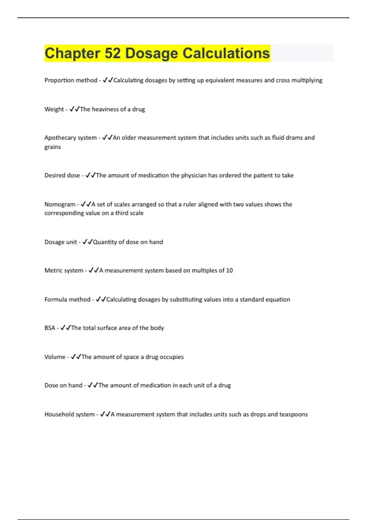 Proportion method - Calculating dosages by setting up equivalent measures and cross multiplying Weight - The heaviness of a drug Apothecary system - An older measurement system that includes units such as fluid drams and grains Desired dose - The amount of medication the physician has ordered the patient to take Nomogram - A set of scales arranged so that a ruler aligned with two values shows the corresponding value on a third scale Dosage unit - Quantity of dose on hand Metric system - A measurement system based on multiples of 10 Formula method - Calculating dosages by substituting values into a standard equation BSA - The total surface area of the body Volume - The amount of space a drug occupies Dose on hand - The amount of medication in each unit of a drug Household system - A measurement system that includes units such as drops and teaspoons