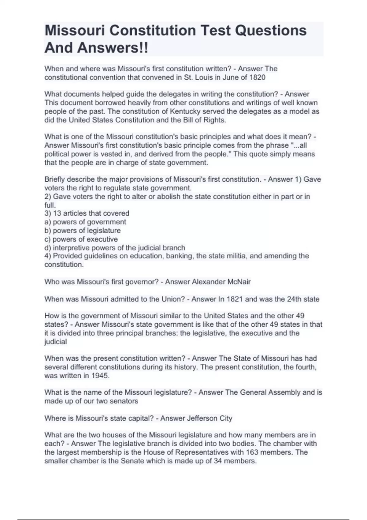 Missouri Constitution Test Questions And Answers!! When and where was Missouri's first constitution written? - Answer The constitutional convention that convened in St. Louis in June of 1820 What documents helped guide the delegates in writing the constitution? - Answer This document borrowed heavily from other constitutions and writings of well known people of the past. The constitution of Kentucky served the delegates as a model as did the United States Constitution and the Bill of Rights. What is one of the Missouri constitution's basic principles and what does it mean? - Answer Missouri's first constitution's basic principle comes from the phrase "...all political power is vested in, and derived from the people." This quote simply means that the people are in charge of state government. Briefly describe the major provisions of Missouri's first constitution. - Answer 1) Gave voters the right to regulate state government. 2) Gave voters the right to alter or abolish the state constitution either in part or in full. 3) 13 articles that covered a) powers of government b) powers of legislature c) powers of executive d) interpretive powers of the judicial branch 4) Provided guidelines on education, banking, the state militia, and amending the constitution. Who was Missouri's first governor? - Answer Alexander McNair When was Missouri admitted to the Union? - Answer In 1821 and was the 24th state How is the government of Missouri similar to the United States and the other 49 states? - Answer Missouri's state government is like that of the other 49 states in that it is divided into three principal branches: the legislative, the executive and the judicial When was the present constitution written? - Answer The State of Missouri has had several different constitutions during its history. The present constitution, the fourth, was written in 1945. What is the name of the Missouri legislature? - Answer The General Assembly and is made up of our two senators Where is Missouri's state capital? - Answer Jefferson City.
