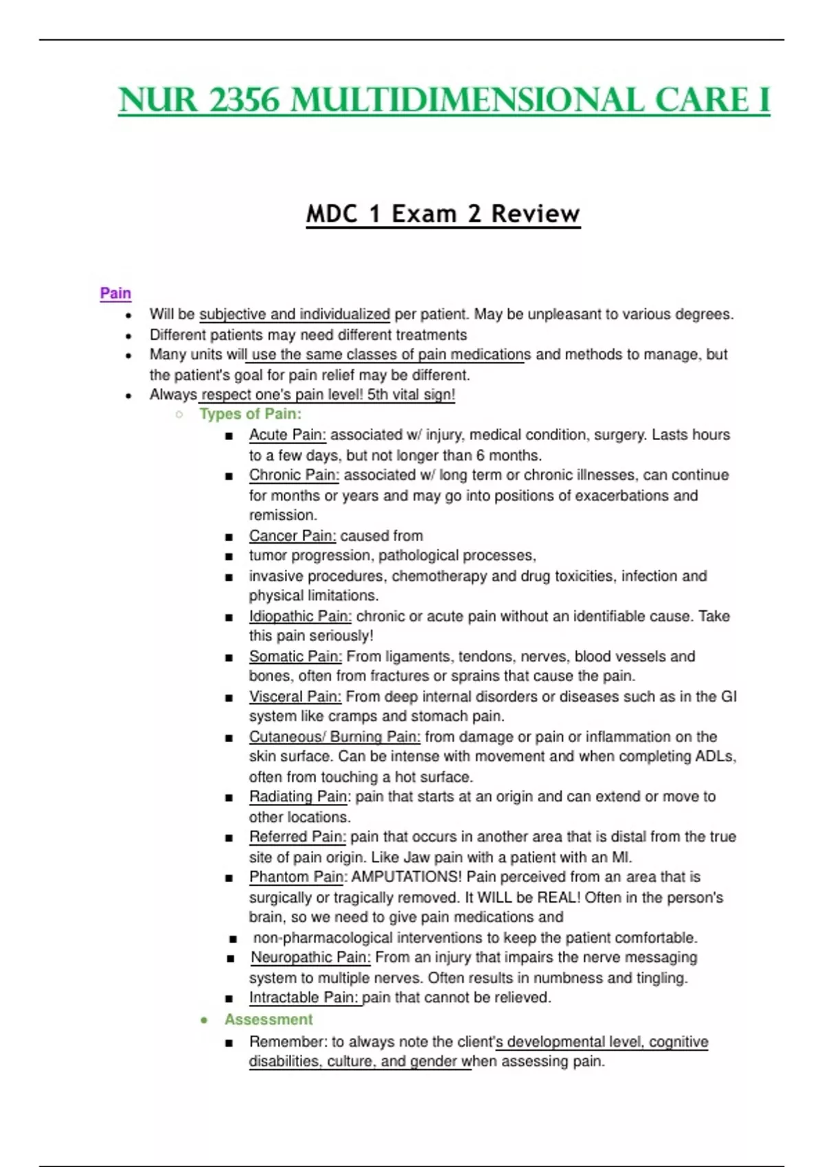 Summary Exam 2 Review - NUR2356 / NUR 2356 (Latest 2023 / 2024) : Multidimensional Care I / MDC 1 - Rasmussen