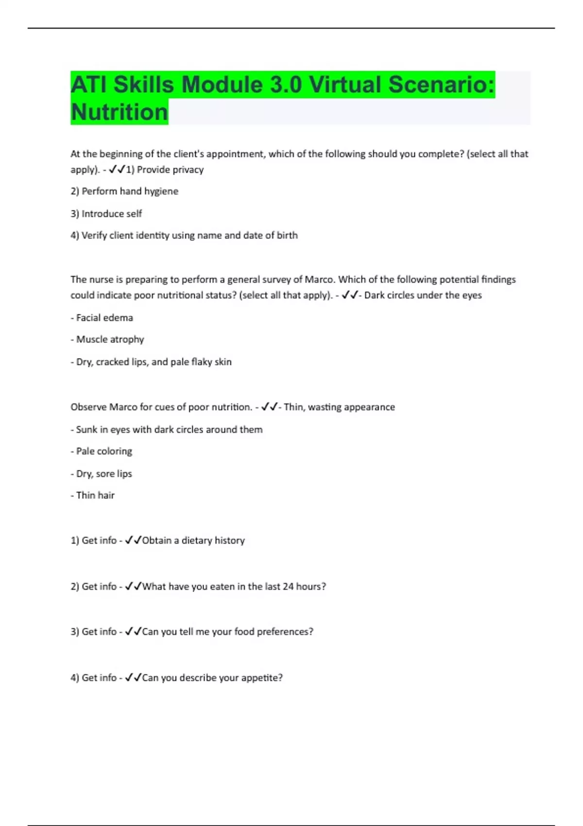 At the beginning of the client's appointment, which of the following should you complete? (select all that apply). - 1) Provide privacy 2) Perform hand hygiene 3) Introduce self 4) Verify client identity using name and date of birth The nurse is preparing to perform a general survey of Marco. Which of the following potential findings could indicate poor nutritional status? (select all that apply). - - Dark circles under the eyes - Facial edema - Muscle atrophy - Dry, cracked lips, and pale flaky skin Observe Marco for cues of poor nutrition. - - Thin, wasting appearance - Sunk in eyes with dark circles around them - Pale coloring - Dry, sore lips - Thin hair 1) Get info - Obtain a dietary history 2) Get info - What have you eaten in the last 24 hours? 3) Get info - Can you tell me your food preferences? 4) Get info - Can you describe your appetite?