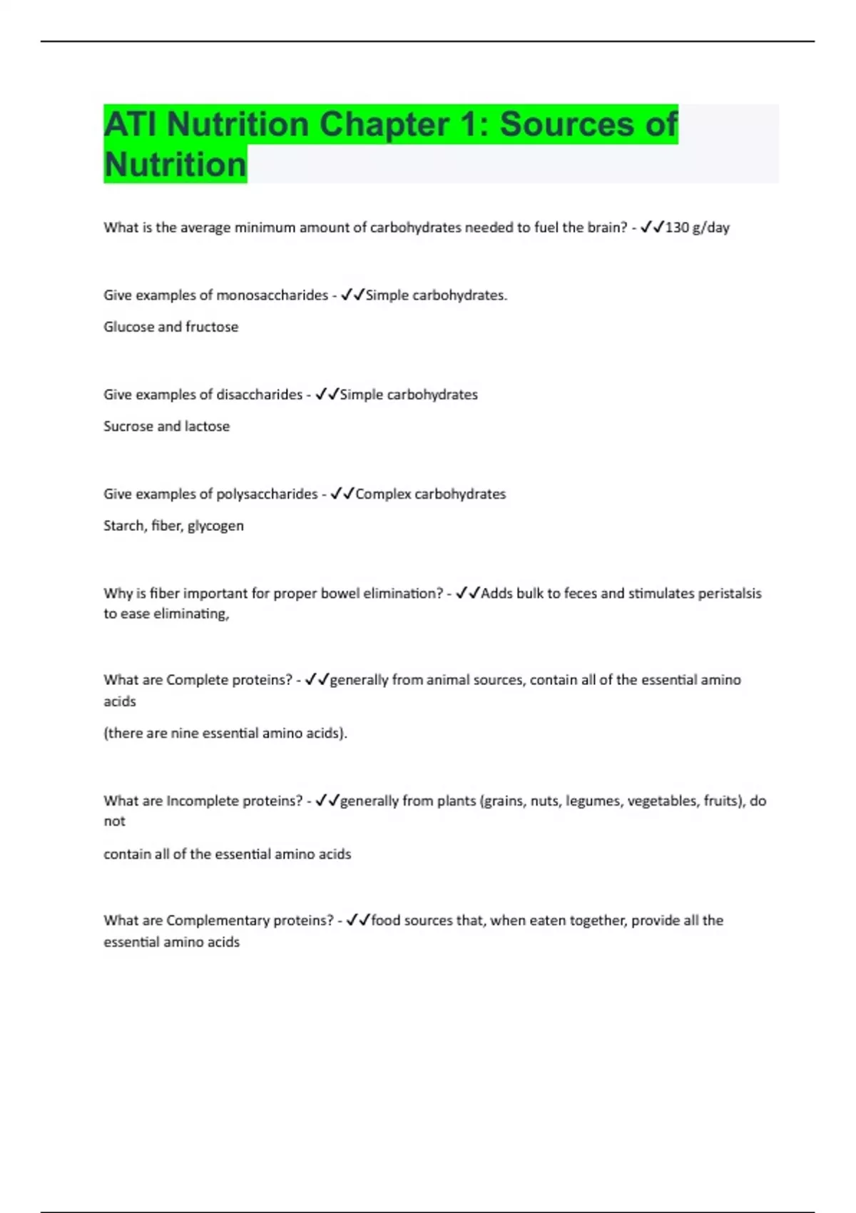 What is the average minimum amount of carbohydrates needed to fuel the brain? - 130 g/day Give examples of monosaccharides - Simple carbohydrates. Glucose and fructose Give examples of disaccharides - Simple carbohydrates Sucrose and lactose Give examples of polysaccharides - Complex carbohydrates Starch, fiber, glycogen Why is fiber important for proper bowel elimination? - Adds bulk to feces and stimulates peristalsis to ease eliminating, What are Complete proteins? - generally from animal sources, contain all of the essential amino acids (there are nine essential amino acids). What are Incomplete proteins? - generally from plants (grains, nuts, legumes, vegetables, fruits), do not contain all of the essential amino acids What are Complementary proteins? - food sources that, when eaten together, provide all the essential amino acids