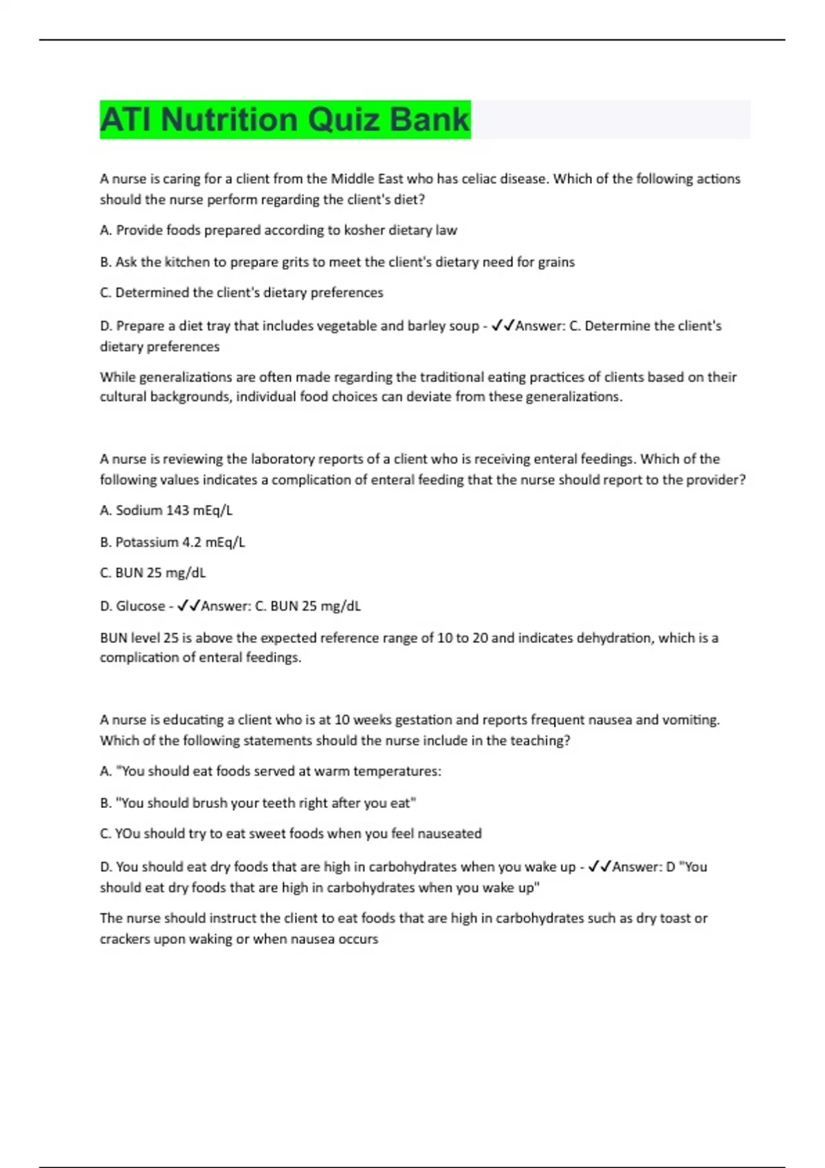 A nurse is caring for a client from the Middle East who has celiac disease. Which of the following actions should the nurse perform regarding the client's diet? A. Provide foods prepared according to kosher dietary law B. Ask the kitchen to prepare grits to meet the client's dietary need for grains C. Determined the client's dietary preferences D. Prepare a diet tray that includes vegetable and barley soup - Answer: C. Determine the client's dietary preferences While generalizations are often made regarding the traditional eating practices of clients based on their cultural backgrounds, individual food choices can deviate from these generalizations. A nurse is reviewing the laboratory reports of a client who is receiving enteral feedings. Which of the following values indicates a complication of enteral feeding that the nurse should report to the provider? A. Sodium 143 mEq/L B. Potassium 4.2 mEq/L C. BUN 25 mg/dL D. Glucose - Answer: C. BUN 25 mg/dL BUN level 25 is above the expected reference range of 10 to 20 and indicates dehydration, which is a complication of enteral feedings. A nurse is educating a client who is at 10 weeks gestation and reports frequent nausea and vomiting. Which of the following statements should the nurse include in the teaching? A. "You should eat foods served at warm temperatures: B. "You should brush your teeth right after you eat" C. YOu should try to eat sweet foods when you feel nauseated D. You should eat dry foods that are high in carbohydrates when you wake up - Answer: D "You should eat dry foods that are high in carbohydrates when you wake up" The nurse should instruct the client to eat foods that are high in carbohydrates such as dry toast or crackers upon waking or when nausea occurs