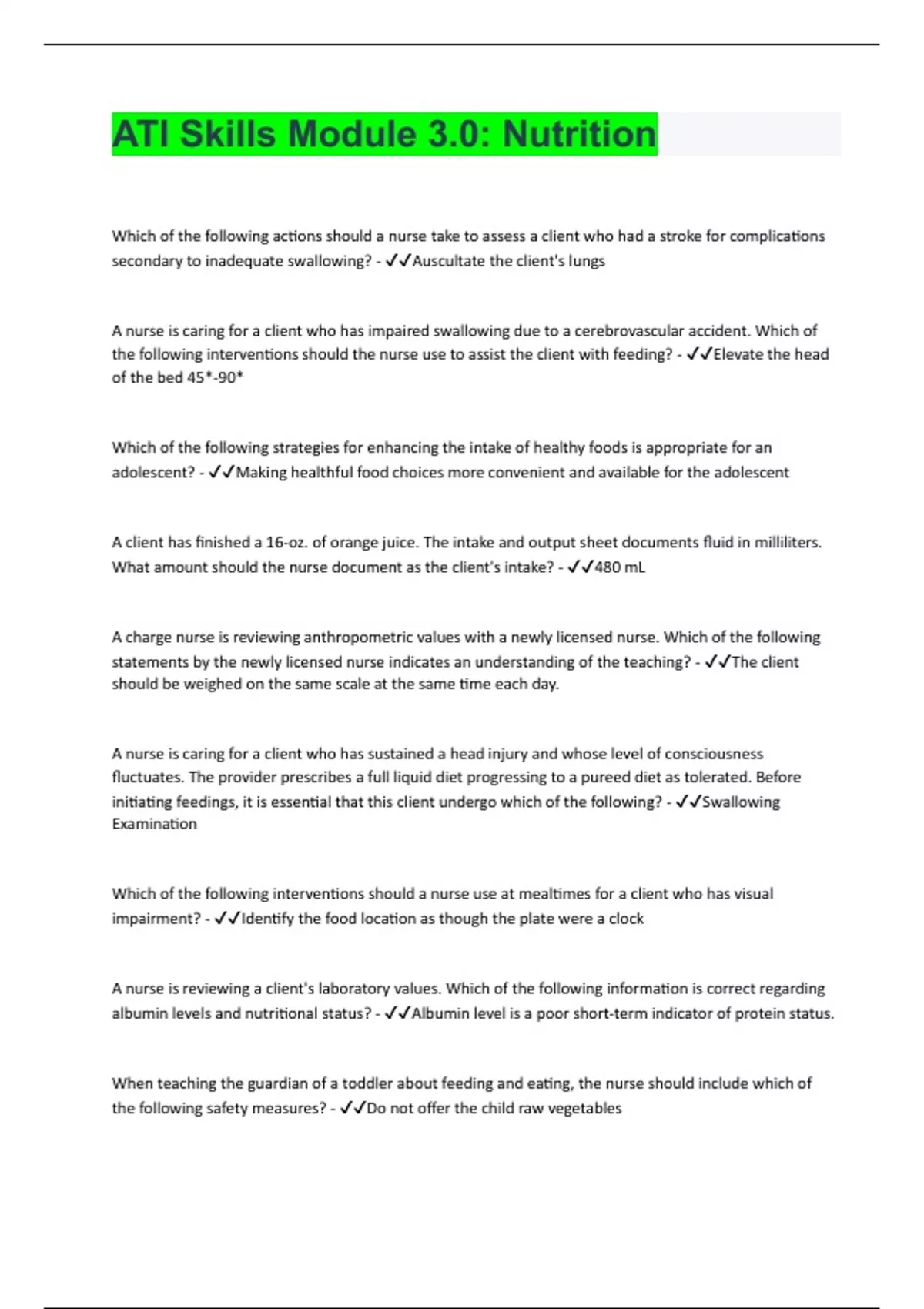 ATI Skills Module 3.0: Nutrition| Questions With 100% Correct Answers | Verified
