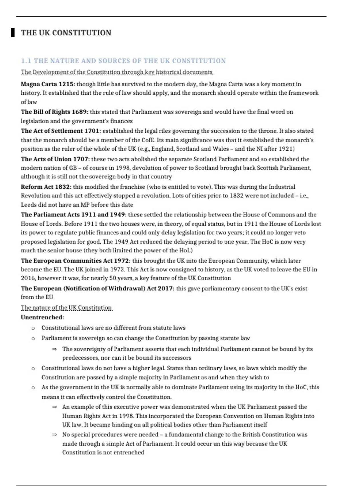 1.1 THE NATURE AND SOURCES OF THE UK CONSTITUTION