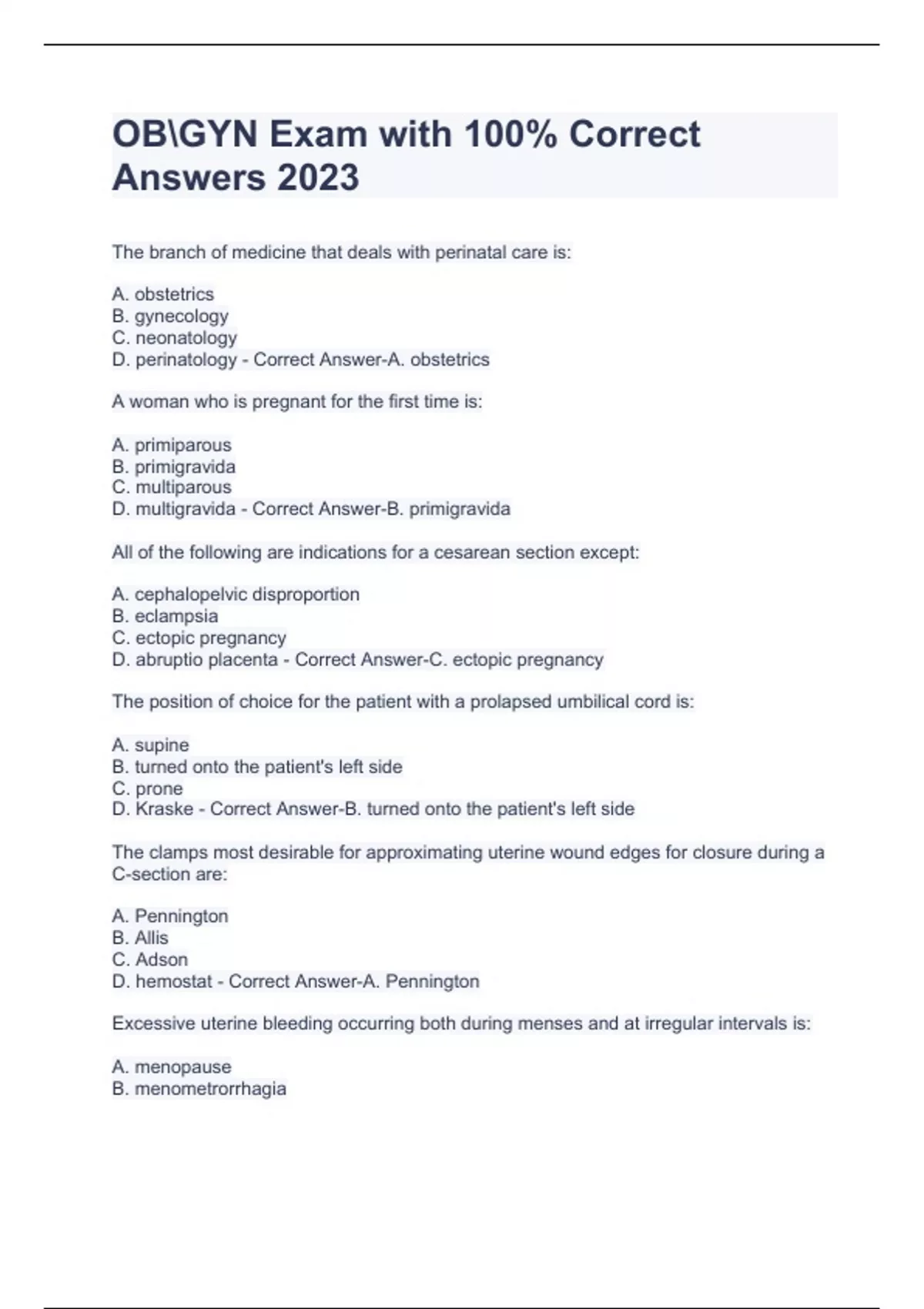obgyn exam with 100 correct answers 2023