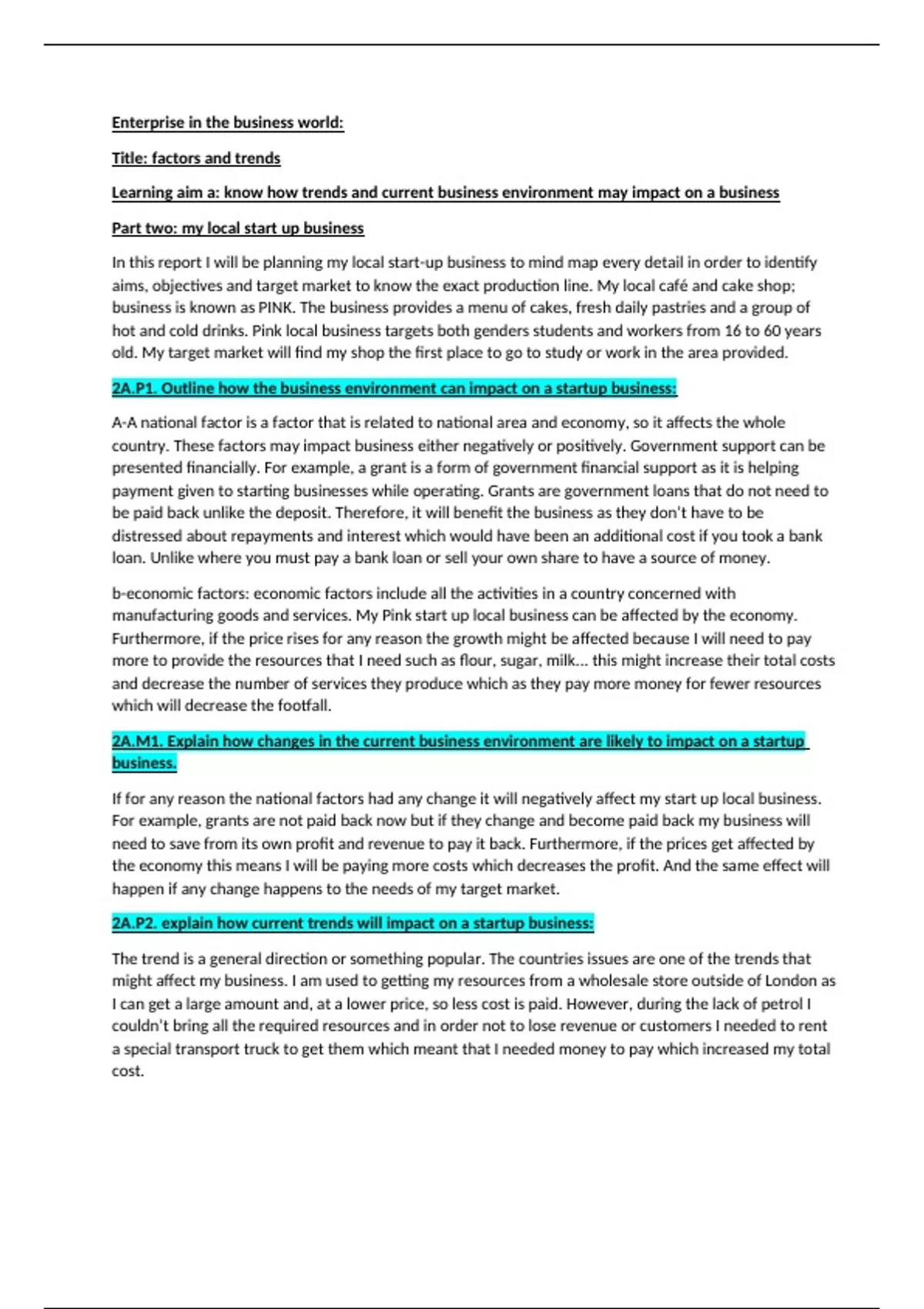 this document is for a Level 1/ level 2 First award, suitable for GCSE students who are doing BTEC business studies which is equivalent to 2 GCSEs, this unit is called the Enterprise in the business world, learning aim a