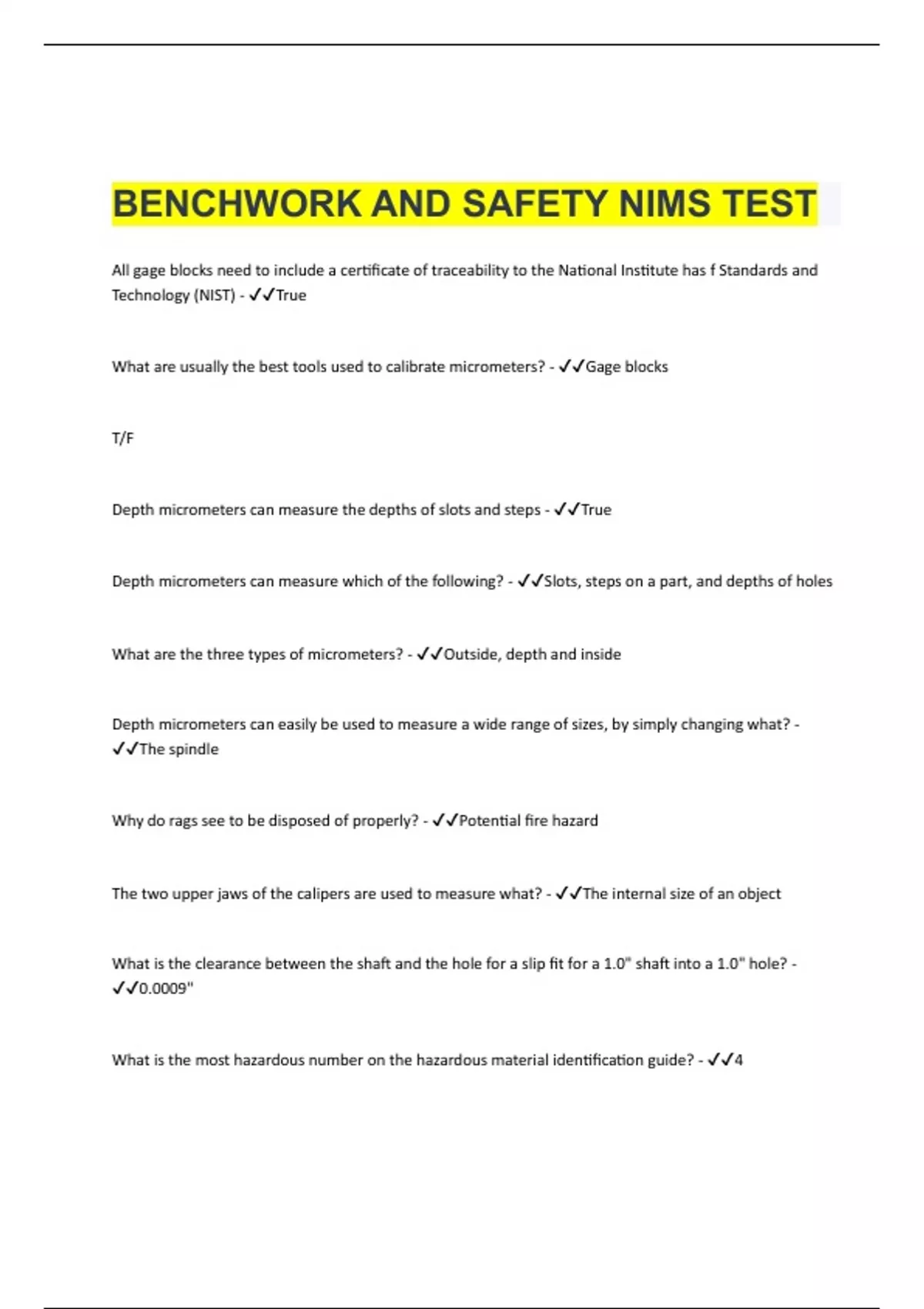 BENCHWORK AND SAFETY NIMS TEST| Questions With 100% Correct Answers | Verified