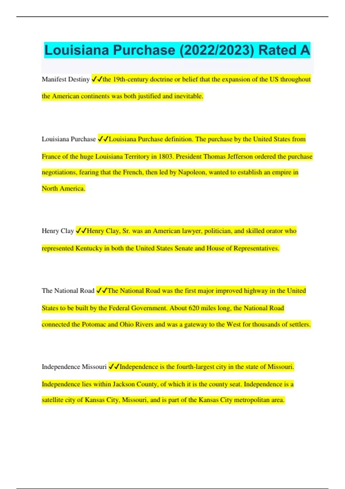 Louisiana Purchase (2022/2023) Rated A Manifest Destiny the 19th-century doctrine or belief that the expansion of the US throughout the American continents was both justified and inevitable. Louisiana Purchase Louisiana Purchase definition. The purchase by the United States from France of the huge Louisiana Territory in 1803. President Thomas Jefferson ordered the purchase negotiations, fearing that the French, then led by Napoleon, wanted to establish an empire in North America. Henry Clay Henry Clay, Sr. was an American lawyer, politician, and skilled orator who represented Kentucky in both the United States Senate and House of Representatives. The National Road The National Road was the first major improved highway in the United States to be built by the Federal Government. About 620 miles long, the National Road connected the Potomac and Ohio Rivers and was a gateway to the West for thousands of settlers. Independence Missouri Independence is the fourth-largest city in the state of Missouri. Independence lies within Jackson County, of which it is the county seat. Independence is a satellite city of Kansas City, Missouri, and is part of the Kansas City metropolitan area. Oregon Trail The Oregon Trail is a 2,200-mile historic east-west large wheeled wagon route and emigrant trail that connected the Missouri River to valleys in Oregon. California Gold Rush The California Gold Rush () began on January 24, 1848, when gold was found by James W. Marshall at Sutter's Mill in Coloma, California. Santa Fe Trial The Santa Fe Trail was a 19th-century transportation route through central North America that connected Franklin, Missouri with Santa Fe, New Mexico. Old Spanish Trail The Old Spanish Trail is a historical trade route which connected the northern New Mexico settlements near or in Santa Fe, New Mexico with that of Los Angeles, California and southern California. Mormon Trial The Mormon Trail or Mormon Pioneer Trail is the 1,300 mile route that members of The Church of Jesus Christ of Latter-day Saints traveled from 1846 to 1868. Missouri Compromise The Missouri Compromise was an effort by Congress to defuse the sectional and political rivalries triggered by the request of Missouri late in 1819 for admission as a state in which slavery would be permitted. At the time, the United States contained twenty-two states, evenly divided between slave and free. Indian Removal Act 1830 The Indian Removal Act was passed by Congress on May 28, 1830, during the presidency of Andrew Jackson. The law authorized the president to negotiate with Indian tribes in the Southern United States for their removal to federal territory west of the Mississippi River in exchange for their ancestral homelands.