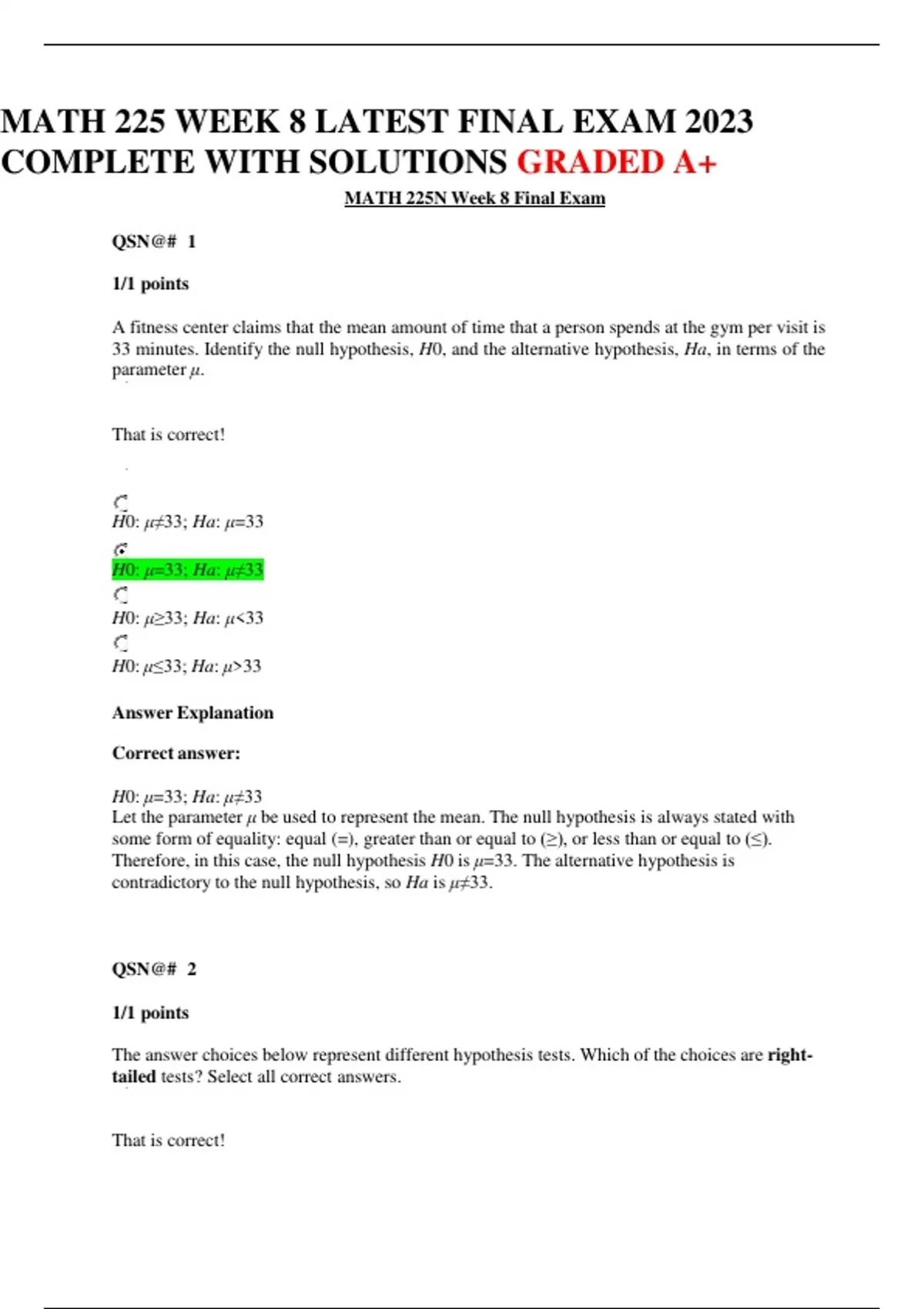 MATH 225 WEEK 8 LATEST FINAL EXAM 2023 COMPLETE WITH SOLUTIONS GRADED A+
