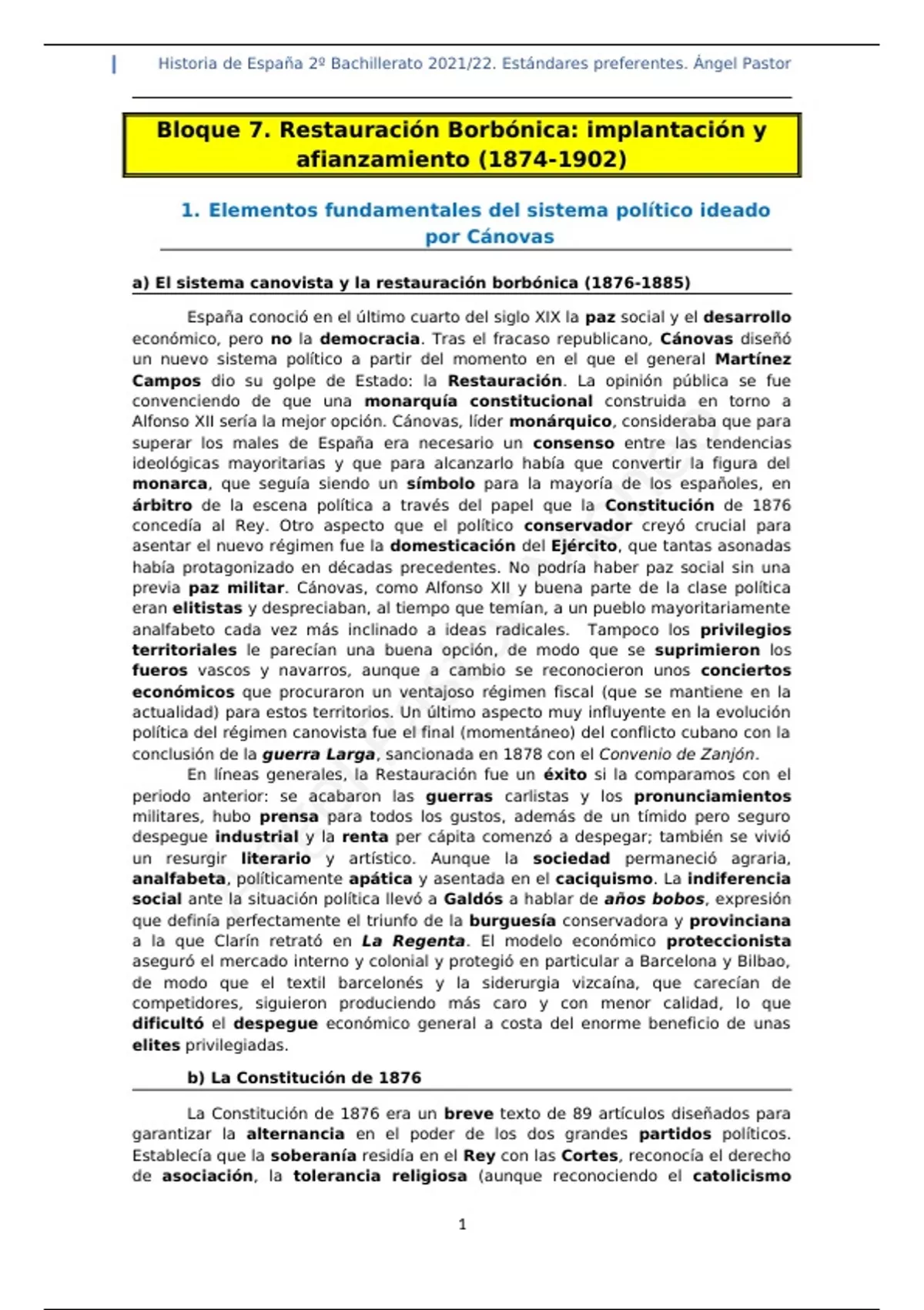 , Historia de España 2º Bachillerato 2021/22. Estándares preferentes. Ángel Pastor