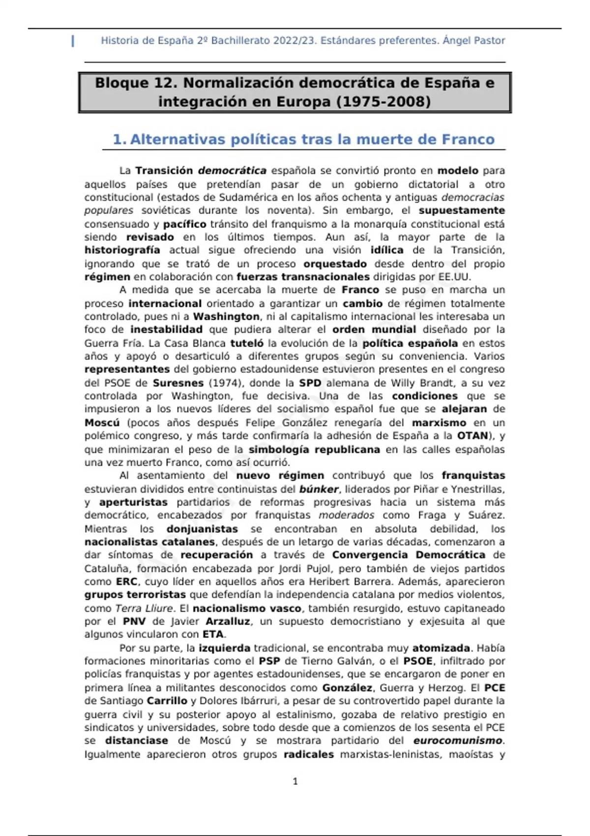 , Historia de España 2º Bachillerato 2022/23. Estándares preferentes. Ángel Pastor