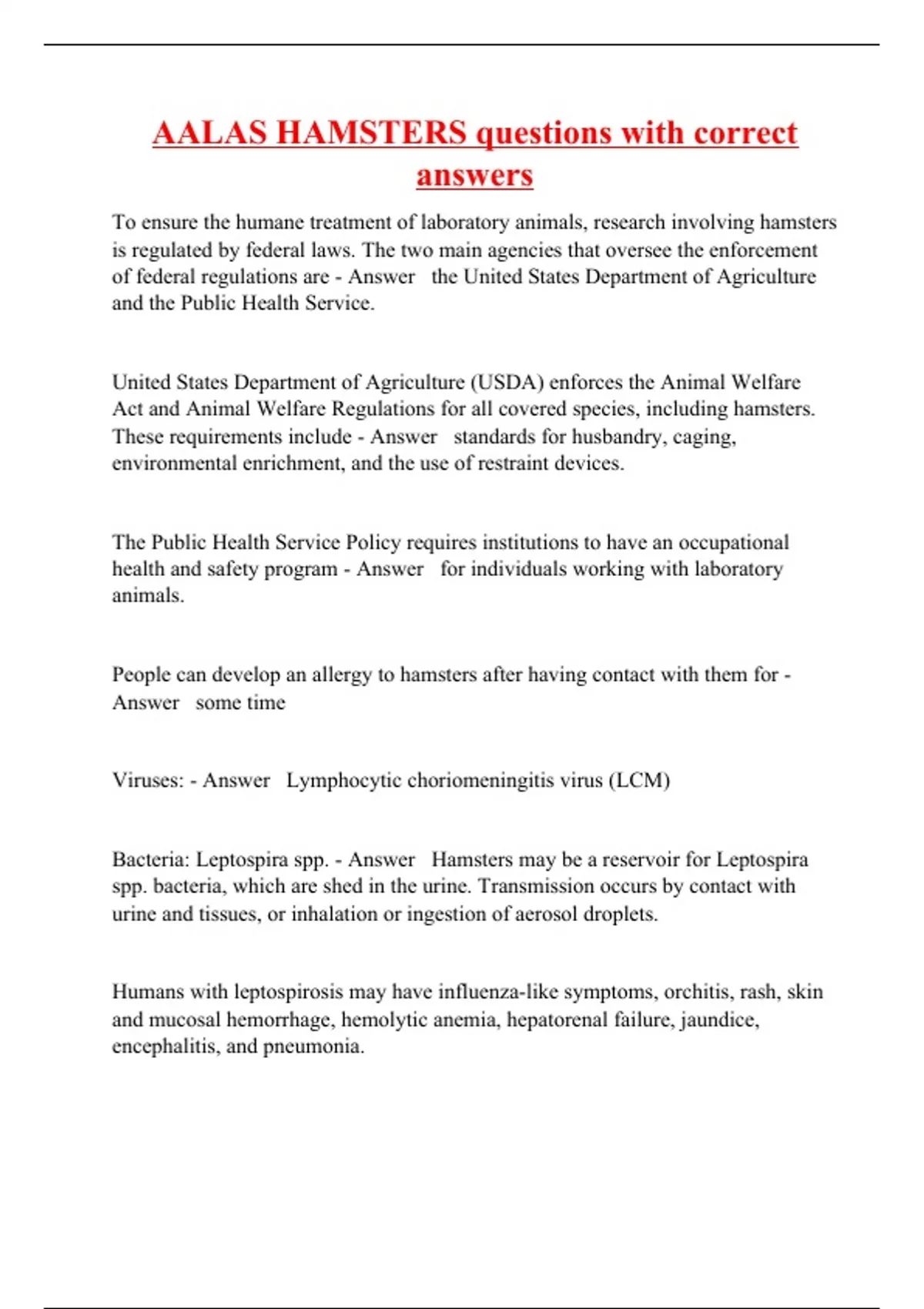 AALAS HAMSTERS questions with correct answers