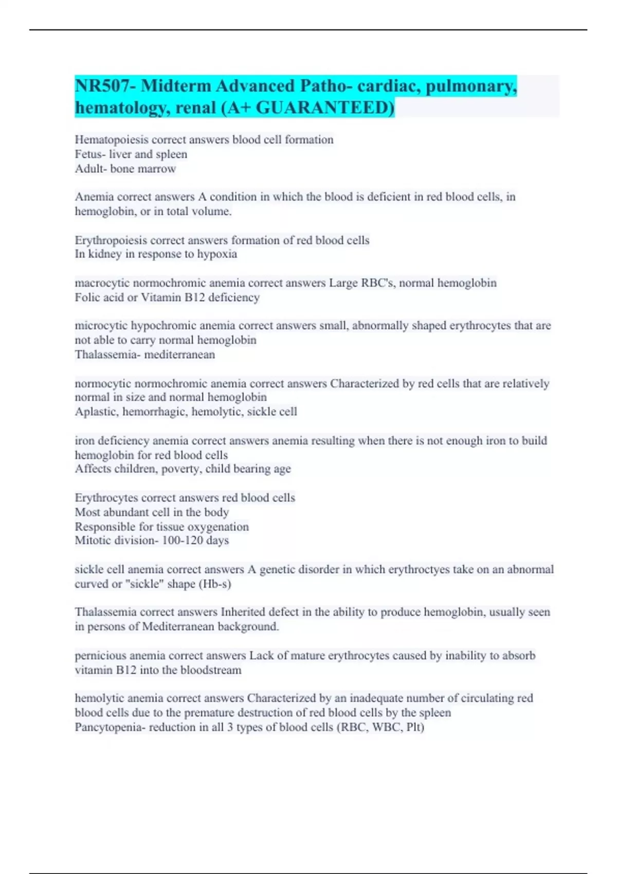 Hematopoiesis correct answers blood cell formation Fetus- liver and spleen Adult- bone marrow Anemia correct answers A condition in which the blood is deficient in red blood cells, in hemoglobin, or in total volume. Erythropoiesis correct answers formation of red blood cells In kidney in response to hypoxia macrocytic normochromic anemia correct answers Large RBC's, normal hemoglobin Folic acid or Vitamin B12 deficiency microcytic hypochromic anemia correct answers small, abnormally shaped erythrocytes that are not able to carry normal hemoglobin Thalassemia- mediterranean normocytic normochromic anemia correct answers Characterized by red cells that are relatively normal in size and normal hemoglobin Aplastic, hemorrhagic, hemolytic, sickle cell iron deficiency anemia correct answers anemia resulting when there is not enough iron to build hemoglobin for red blood cells Affects children, poverty, child bearing age Erythrocytes correct answers red blood cells Most abundant cell in the body Responsible for tissue oxygenation Mitotic division- 100-120 days sickle cell anemia correct answers A genetic disorder in which erythroctyes take on an abnormal curved or "sickle" shape (Hb-s) Thalassemia correct answers Inherited defect in the ability to produce hemoglobin, usually seen in persons of Mediterranean background. pernicious anemia correct answers Lack of mature erythrocytes caused by inability to absorb vitamin B12 into the bloodstream hemolytic anemia correct answers Characterized by an inadequate number of circulating red blood cells due to the premature destruction of red blood cells by the spleen Pancytopenia- reduction in all 3 types of blood cells (RBC, WBC, Plt)