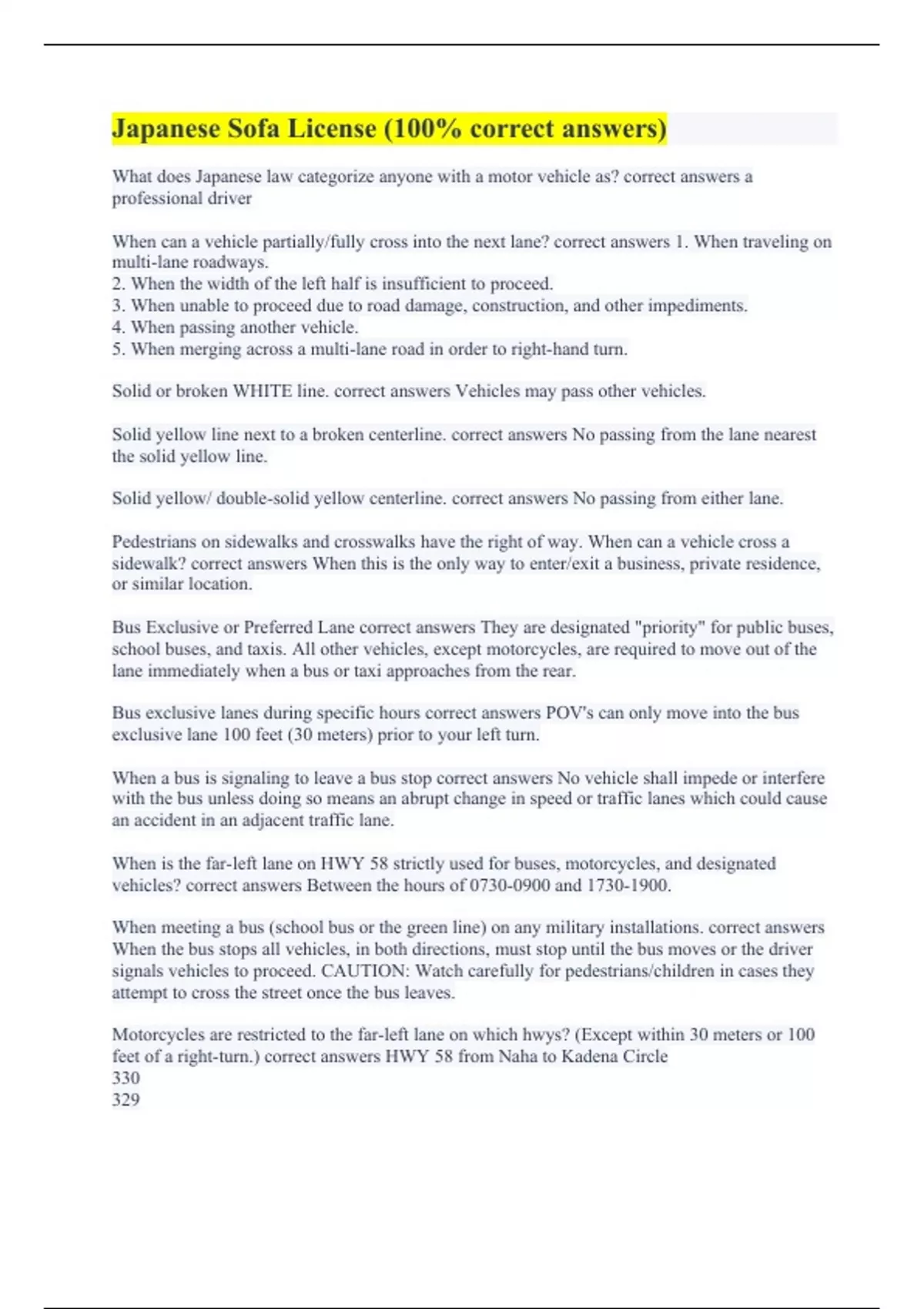 What does Japanese law categorize anyone with a motor vehicle as? correct answers a professional driver When can a vehicle partially/fully cross into the next lane? correct answers 1. When traveling on multi-lane roadways. 2. When the width of the left half is insufficient to proceed. 3. When unable to proceed due to road damage, construction, and other impediments. 4. When passing another vehicle. 5. When merging across a multi-lane road in order to right-hand turn. Solid or broken WHITE line. correct answers Vehicles may pass other vehicles. Solid yellow line next to a broken centerline. correct answers No passing from the lane nearest the solid yellow line. Solid yellow/ double-solid yellow centerline. correct answers No passing from either lane. Pedestrians on sidewalks and crosswalks have the right of way. When can a vehicle cross a sidewalk? correct answers When this is the only way to enter/exit a business, private residence, or similar location. Bus Exclusive or Preferred Lane correct answers They are designated "priority" for public buses, school buses, and taxis. All other vehicles, except motorcycles, are required to move out of the lane immediately when a bus or taxi approaches from the rear. Bus exclusive lanes during specific hours correct answers POV's can only move into the bus exclusive lane 100 feet (30 meters) prior to your left turn. When a bus is signaling to leave a bus stop correct answers No vehicle shall impede or interfere with the bus unless doing so means an abrupt change in speed or traffic lanes which could cause an accident in an adjacent traffic lane. When is the far-left lane on HWY 58 strictly used for buses, motorcycles, and designated vehicles? correct answers Between the hours of and . When meeting a bus (school bus or the green line) on any military installations. correct answers When the bus stops all vehicles, in both directions, must stop until the bus moves or the driver signals vehicles to proceed. CAUTION: Watch carefully for pedestrians/children in cases they attempt to cross the street once the bus leaves. Motorcycles are restricted to the far-left lane on which hwys? (Except within 30 meters or 100 feet of a right-turn.) correct answers HWY 58 from Naha to Kadena Circle 330 329