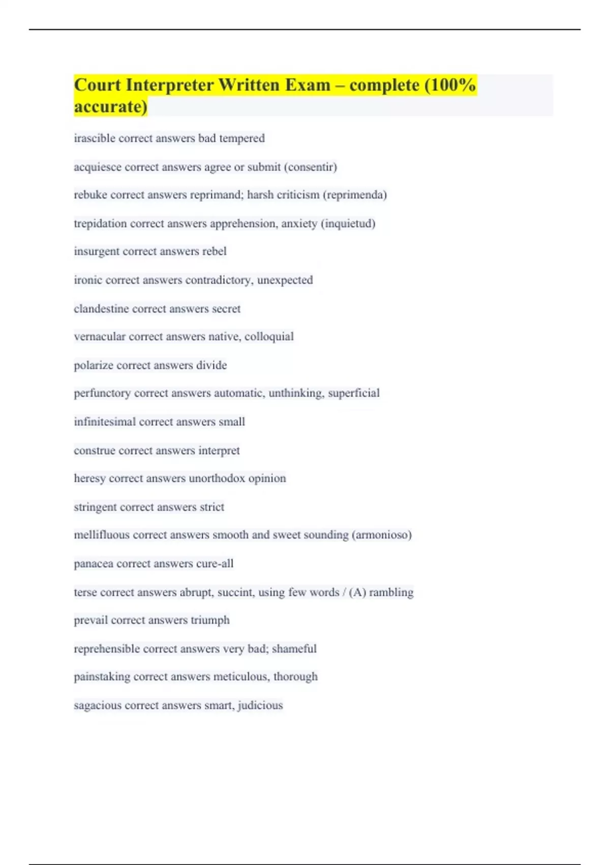 irascible correct answers bad tempered acquiesce correct answers agree or submit (consentir) rebuke correct answers reprimand; harsh criticism (reprimenda) trepidation correct answers apprehension, anxiety (inquietud) insurgent correct answers rebel ironic correct answers contradictory, unexpected clandestine correct answers secret vernacular correct answers native, colloquial polarize correct answers divide perfunctory correct answers automatic, unthinking, superficial infinitesimal correct answers small construe correct answers interpret heresy correct answers unorthodox opinion stringent correct answers strict mellifluous correct answers smooth and sweet sounding (armonioso) panacea correct answers cure-all terse correct answers abrupt, succint, using few words / (A) rambling prevail correct answers triumph reprehensible correct answers very bad; shameful painstaking correct answers meticulous, thorough sagacious correct answers smart, judicious