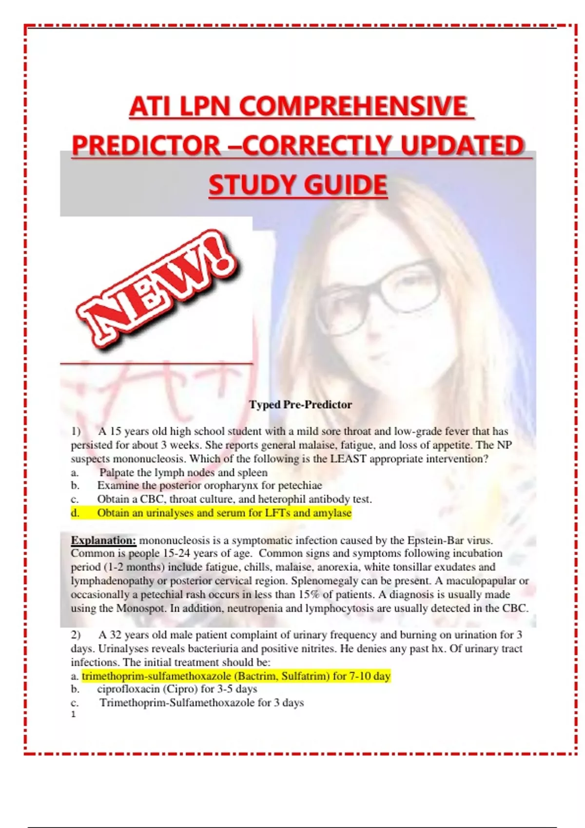 ATI LPN COMPREHENSIVE PREDICTOR –CORRECTLY UPDATED STUDY GUIDE Typed Pre-Predictor 1) A 15 years old high school student with a mild sore throat and low-grade fever that has persisted for about 3 weeks. She reports general malaise, fatigue, and loss of appetite. The NP suspects mononucleosis. Which of the following is the LEAST appropriate intervention? a. Palpate the lymph nodes and spleen b. Examine the posterior oropharynx for petechiae c. Obtain a CBC, throat culture, and heterophil antibody test. d. Obtain an urinalyses and serum for LFTs and amylase Explanation: mononucleosis is a symptomatic infection caused by the Epstein-Bar virus. Common is people 15-24 years of age. Common signs and symptoms following incubation period (1-2 months) include fatigue, chills, malaise, anorexia, white tonsillar exudates and lymphadenopathy or posterior cervical region. Splenomegaly can be present. A maculopapular or occasionally a petechial rash occurs in less than 15% of patients. A diagnosis is usually made using the Monospot. In addition, neutropenia and lymphocytosis are usually detected in the CBC. 2) A 32 years old male patient complaint of urinary frequency and burning on urination for 3 days. Urinalyses reveals bacteriuria and positive nitrites. He denies any past hx. Of urinary tract infections. The initial treatment should be: a. trimethoprim-sulfamethoxazole (Bactrim, Sulfatrim) for 7-10 day b. ciprofloxacin (Cipro) for 3-5 days c. Trimethoprim-Sulfamethoxazole for 3 days d. 750 mg ciprofloxacin as a one-time dose Explanation: trimethoprim-sulfamethoxazole (TMPS) is usually n appropriate medication to treat urinary tract infections in most patients. In the case of community resistance to TMPS >20%^, another medication should be substituted. In men, the appropriate length of time is 7-10 days. Women may be treated for 3 days for uncomplicated UTI 3) Which agent is most effective for the treatment of nodulocystic acne? a. Benzoyl peroxide (Benzac) b. Retinoic acid (Retin A) c. Topical tetracycline d. Isotretinoin) Explanation: Isotretinoin (Accutane) is a systemic agent indicated for treatment with severe inflammatory acne. Guidelines for its use must be clearly understood by the patient. A woman of childbearing age must use an effective method of contraception because isotretinoin is teratogenic. There are many restrictions in prescribing this medication because of the teratogenic effects is given during pregnancy. Therefore, it is a pregnancy category X. 4) An 18 y/o woman is taking a combined hormonal oral contraceptive. She should be instructed to use a backup method for the prevention of pregnancy a. Throughout the week of placebo pills b. If prescribed topiramate (Topamax) for the treatment of migraines. c. If prescribed amoxicillin/clavulanate (Augmentin) for a sinus infection d. if she forgets to take a single dose of the contraceptive Explanation: Anticonvulsant including phenytoin (Dilantin), carbamazepine (Tegretol), primidone (Mysoline), topiramate (Topamax) and oxcarbazepine (Trileptal) reduce the effectiveness of contraceptives. Depo-medroxyprogesterone acetate injections or levonorgestrel- releasing intrauterine devices would be a better method of contraceptive for patients taking anticonvulsants. Most commonly used antibiotics have not been proven to reduce the effectiveness of contraceptives. Rifampin is an exception, and additional …. Be used by women taking this drug and using oral contraceptives, transdermal, or vaginal ring preparations. Additional backup contraception should be used if taking antifungal agents. No additional protection is needed thought the week of placebo pills. Missing one single dose of contraceptive does not require additional protection, missing more than one doses does. 5) A 44 years old female patient has diabetes. Her total cholesterol (TC) is 250 mg/dl (6.5 mmol/L), LDL= 190 mg/dL (4.94 mmol/L), HDL= 25 mg/dL (65 mmol/L), and triglycerides= 344 mg/dL (8.94 mmol/L). What agent have the greatest effect on improving her lipid profile and reducing morbidity and mortality associates with dyslipidemia? a. Niacin (Niaspan) b. Atorvastatin c. Omega 3 fatty acids d. Fenofibrates Explanation: First and foremost, it is essential to educate individuals on a heart-healthy lifestyle. LDL-C is one of the major culprits in the development of atherosclerotic heart disease. The target level of LDL-C is between 50 to 70mg/dl to prevent plaque formation in the blood vessels. Guidelines strongly recommend statin therapy because they primarily lower LDL-C levels, but they also have the secondary effects of lowering triglyceride and increasing HDL-C levels. 6) A 30 years old female comes into a clinic with classic signs and symptoms of appendicitis. The NP fails to refer the patient to a surgeon. The appendix ruptures and the woman die. This is an example of a. Failure of diligence b. Professional liability c. Negligence d. Malpractice Explanation: malpractice, a negligence tort, occurs when a health care professional’s actions fall bellow the appropriate standard of care and hurts the patient. In this case the patient came with sings and symptoms indicating appendicitis and the NP failed to refer the patient.. 7) A NP has recently been hired to work in a fast track facility. The NP employer asked if she has “a problem prescribing medications for emergency contraception.” The NP replies affirmatively. This is: a. Grounds for dismissal b. An ethical dilemma for the NP