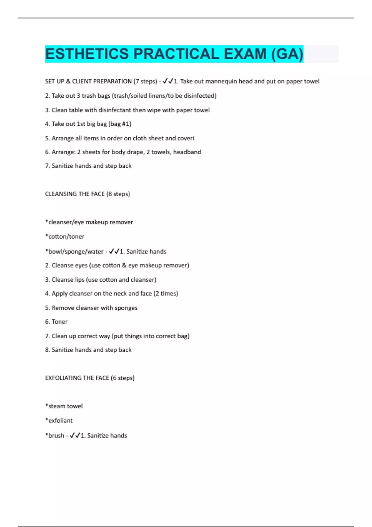 SET UP & CLIENT PREPARATION (7 steps) - 1. Take out mannequin head and put on paper towel 2. Take out 3 trash bags (trash/soiled linens/to be disinfected) 3. Clean table with disinfectant then wipe with paper towel 4. Take out 1st big bag (bag #1) 5. Arrange all items in order on cloth sheet and coveri 6. Arrange: 2 sheets for body drape, 2 towels, headband 7. Sanitize hands and step back CLEANSING THE FACE (8 steps) *cleanser/eye makeup remover *cotton/toner *bowl/sponge/water - 1. Sanitize hands 2. Cleanse eyes (use cotton & eye makeup remover) 3. Cleanse lips (use cotton and cleanser) 4. Apply cleanser on the neck and face (2 times) 5. Remove cleanser with sponges 6. Toner 7. Clean up correct way (put things into correct bag) 8. Sanitize hands and step back EXFOLIATING THE FACE (6 steps) *steam towel *exfoliant *brush - 1. Sanitize hands