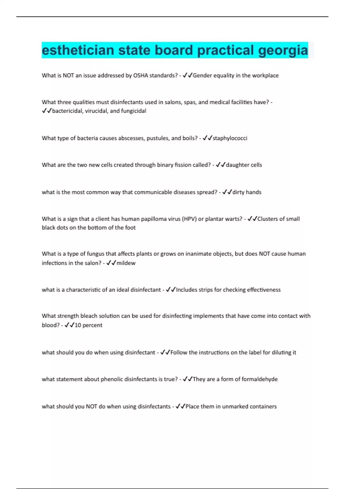 esthetician state board practical georgia| Questions with 100% Correct Answers | Verified