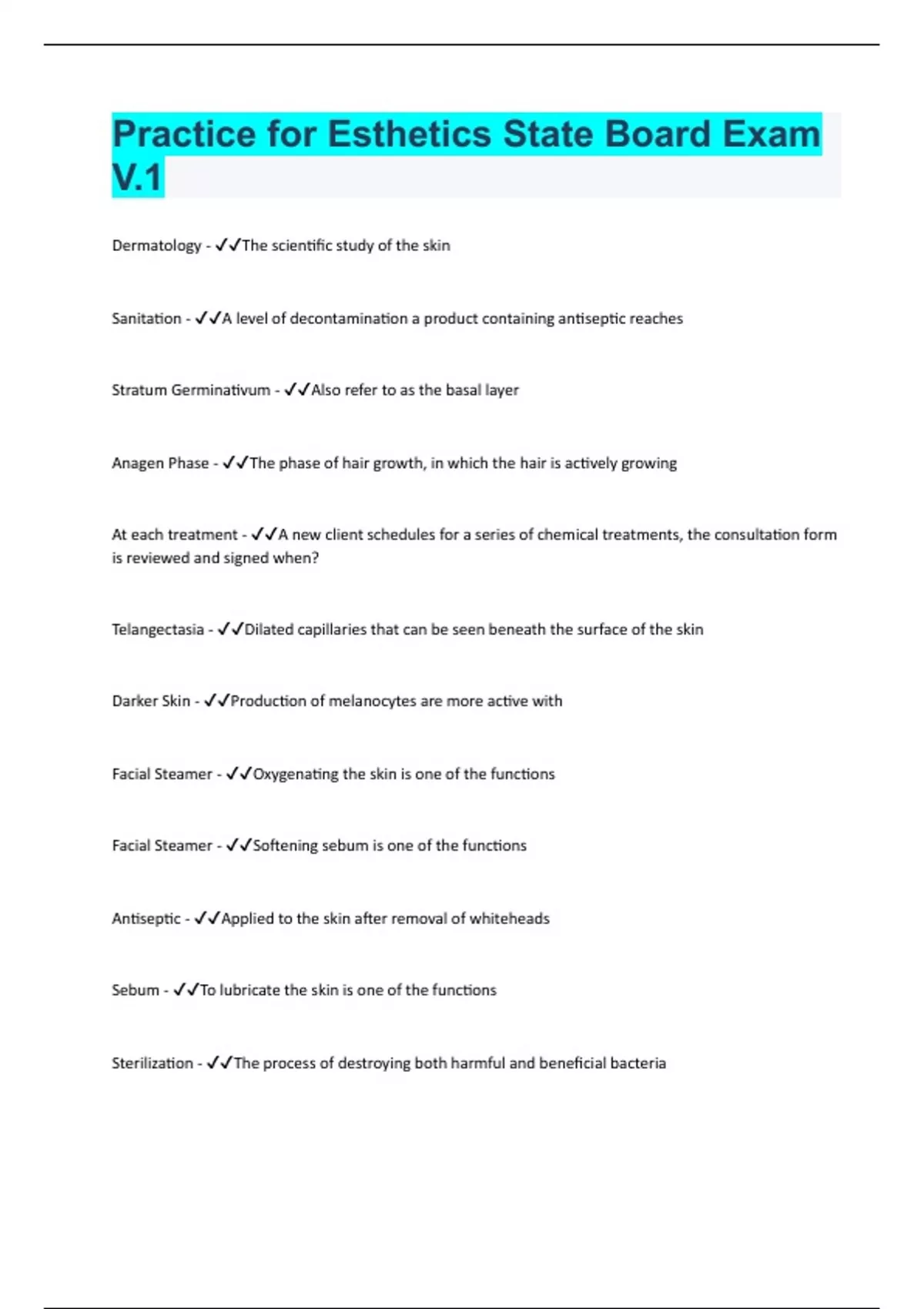 Practice for Esthetics State Board Exam V.1| Questions with 100% Correct Answers | Verified