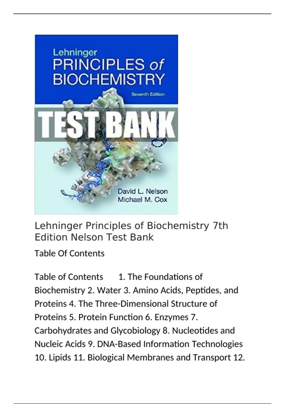 Lehninger Principles of Biochemistry 7th Edition Nelson Test Bank Table Of Contents Table of Contents 1. The Foundations of Biochemistry 2. Water 3. Amino Acids, Peptides, and Proteins 4. The Three-Dimensional Structure of Proteins 5. Protein Function 6. Enzymes 7. Carbohydrates and Glycobiology 8. Nucleotides and Nucleic Acids 9. DNA-Based Information Technologies 10. Lipids 11. Biological Membranes and Transport 12. Biosignaling 13. Bioenergetics and Biochemical Reaction Types 14. Glycolysis, Gluconeogenesis, and the Pentose Phosphate Pathway 15. Principles of Metabolic Regulation 16. The Citric Acid Cycle 17. Fatty Acid Catabolism 18. Amino Acid Oxidation and the Production of Urea 19. Oxidative Phosphorylation and Photophosphorylation Oxidative Phosphorylation 20. Carbohydrate Biosynthesis in Plants and Bacteria 21. Lipid Biosynthesis 22. Biosynthesis of Amino Acids, Nucleotides, and Related Molecules 23. Hormonal Regulation and Integration of Mammalian Metabolism 24. Genes and Chromosomes 25. DNA Metabolism 26. RNA Metabolism 27. Protein Metabolism 28. Regulation of Gene Expression
