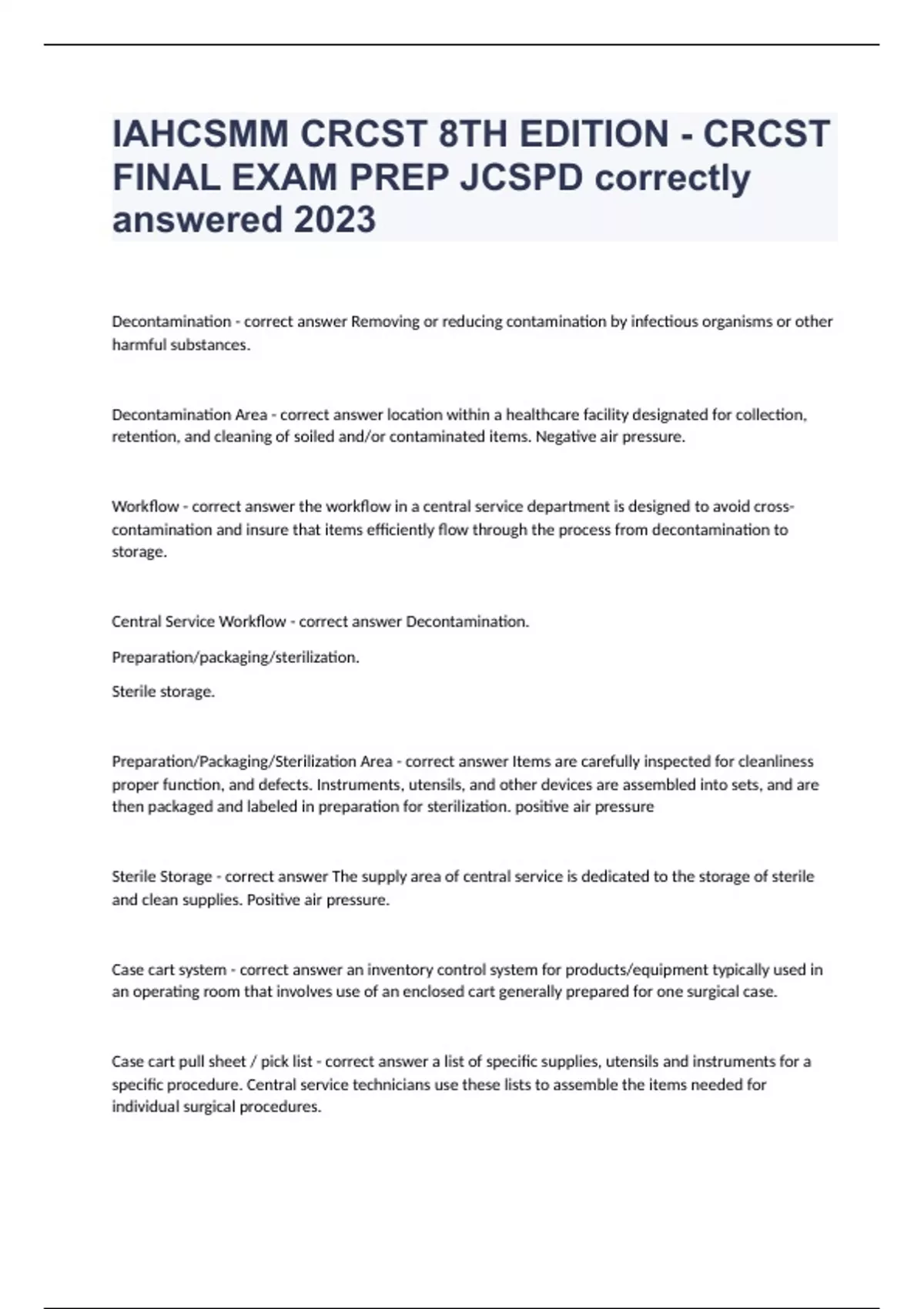 IAHCSMM CRCST 8TH EDITION - CRCST FINAL EXAM PREP JCSPD correctly answered 2023Decontamination - correct answer Removing or reducing contamination by infectious organisms or other harmful substances. Decontamination Area - correct answer location within a healthcare facility designated for collection, retention, and cleaning of soiled and/or contaminated items. Negative air pressure. Workflow - correct answer the workflow in a central service department is designed to avoid cross-contamination and insure that items efficiently flow through the process from decontamination to storage. Central Service Workflow - correct answer Decontamination. Preparation/packaging/sterilization. Sterile storage. Preparation/Packaging/Sterilization Area - correct answer Items are carefully inspected for cleanliness proper function, and defects. Instruments, utensils, and other devices are assembled into sets, and are then packaged and labeled in preparation for sterilization. positive air pressure Sterile Storage - correct answer The supply area of central service is dedicated to the storage of sterile and clean supplies. Positive air pressure. Case cart system - correct answer an inventory control system for products/equipment typically used in an operating room that involves use of an enclosed cart generally prepared for one surgical case. Case cart pull sheet / pick list - correct answer a list of specific supplies, utensils and instruments for a specific procedure. Central service technicians use these lists to assemble the items needed for individual surgical procedures.