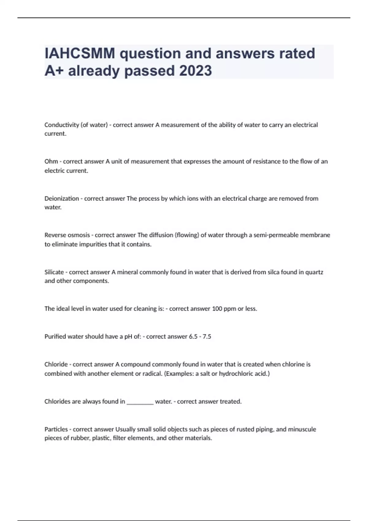 IAHCSMM question and answers rated A+ already passed 2023 Conductivity (of water) - correct answer A measurement of the ability of water to carry an electrical current. Ohm - correct answer A unit of measurement that expresses the amount of resistance to the flow of an electric current. Deionization - correct answer The process by which ions with an electrical charge are removed from water. Reverse osmosis - correct answer The diffusion (flowing) of water through a semi-permeable membrane to eliminate impurities that it contains. Silicate - correct answer A mineral commonly found in water that is derived from silca found in quartz and other components. The ideal level in water used for cleaning is: - correct answer 100 ppm or less. Purified water should have a pH of: - correct answer 6.5 - 7.5 Chloride - correct answer A compound commonly found in water that is created when chlorine is combined with another element or radical. (Examples: a salt or hydrochloric acid.) Chlorides are always found in ________ water. - correct answer treated. Particles - correct answer Usually small solid objects such as pieces of rusted piping, and minuscule pieces of rubber, plastic, filter elements, and other materials. Turbidity - correct answer Occurs when water contains sediments or solids that, when stirred, make the water appear cloudy. Tap water - correct answer Water that has been treated, and is acceptable for drinking. Microns - correct answer Unit of measurement; 1/1000 of a millimeter or 1/25,000 of an inch, or one millionth of a meter. (Note: a meter equals 39.37 inches.) Granular Activated Charcoal (GAC) - correct answer Is used to remove chlorides in water. Softeners - correct answer Used to removed the calcium and magnesium in the water, and the word, "softened," describes the result of the process. Cation resin tank - correct answer A tank into which untreated hard water flows, and in which sodium ions are exchanged for calcium and magnesium ions to produce soft water. Distillation - correct answer Removes dissolved solids, gasses and organics, along with particles, bacteria, pyrogens (pus-producing organisms,) and endotoxins. Hard water stains - correct answer Appear as water spots or gray areas on the inside chamber of cleaning machines and on instruments. Bluish or rainbow-type stains - correct answer Are caused by iron and silicates in the water. Powdery stains or chalky build-ups - correct answer Result from calcium and magnesium in the water. Deionization systems - correct answer Are used for heating/cooling therapy units, and for the final rinse water in manual and automated cleaning processes.