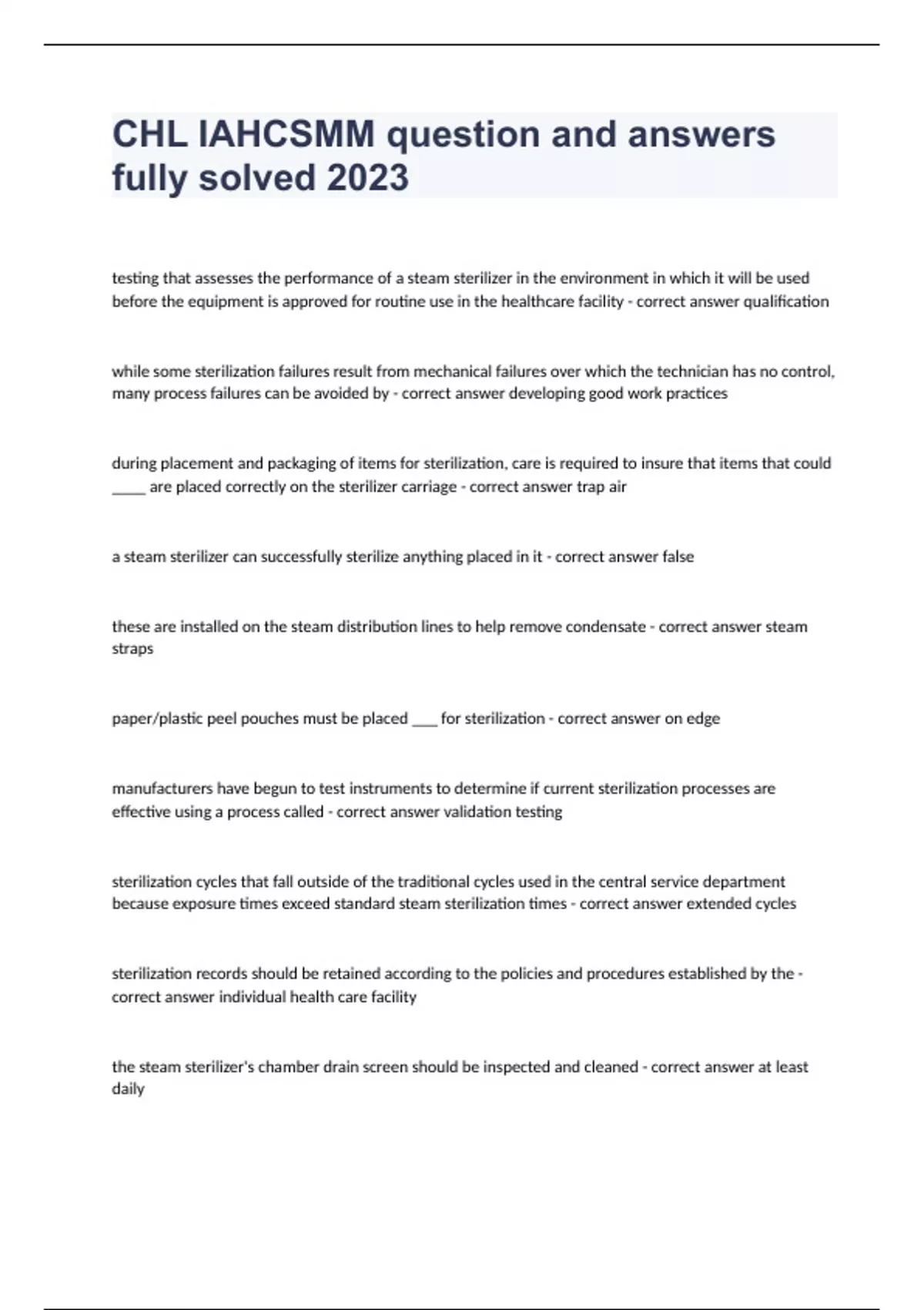 CHL IAHCSMM question and answers fully solved 2023testing that assesses the performance of a steam sterilizer in the environment in which it will be used before the equipment is approved for routine use in the healthcare facility - correct answer qualification while some sterilization failures result from mechanical failures over which the technician has no control, many process failures can be avoided by - correct answer developing good work practices during placement and packaging of items for sterilization, care is required to insure that items that could ____ are placed correctly on the sterilizer carriage - correct answer trap air a steam sterilizer can successfully sterilize anything placed in it - correct answer false these are installed on the steam distribution lines to help remove condensate - correct answer steam straps paper/plastic peel pouches must be placed ___ for sterilization - correct answer on edge manufacturers have begun to test instruments to determine if current sterilization processes are effective using a process called - correct answer validation testing sterilization cycles that fall outside of the traditional cycles used in the central service department because exposure times exceed standard steam sterilization times - correct answer extended cycles sterilization records should be retained according to the policies and procedures established by the - correct answer individual health care facility the steam sterilizer's chamber drain screen should be inspected and cleaned - correct answer at least daily