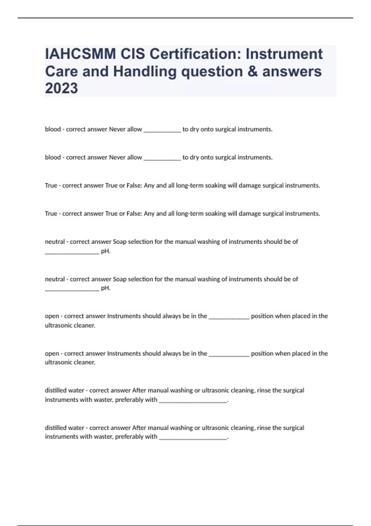 IAHCSMM CIS Certification: Instrument Care and Handling question & answers 2023blood - correct answer Never allow ___________ to dry onto surgical instruments. blood - correct answer Never allow ___________ to dry onto surgical instruments. True - correct answer True or False: Any and all long-term soaking will damage surgical instruments. True - correct answer True or False: Any and all long-term soaking will damage surgical instruments. neutral - correct answer Soap selection for the manual washing of instruments should be of ________________ pH. neutral - correct answer Soap selection for the manual washing of instruments should be of ________________ pH. open - correct answer Instruments should always be in the ____________ position when placed in the ultrasonic cleaner. open - correct answer Instruments should always be in the ____________ position when placed in the ultrasonic cleaner. distilled water - correct answer After manual washing or ultrasonic cleaning, rinse the surgical instruments with waster, preferably with ____________________. distilled water - correct answer After manual washing or ultrasonic cleaning, rinse the surgical instruments with waster, preferably with ____________________.