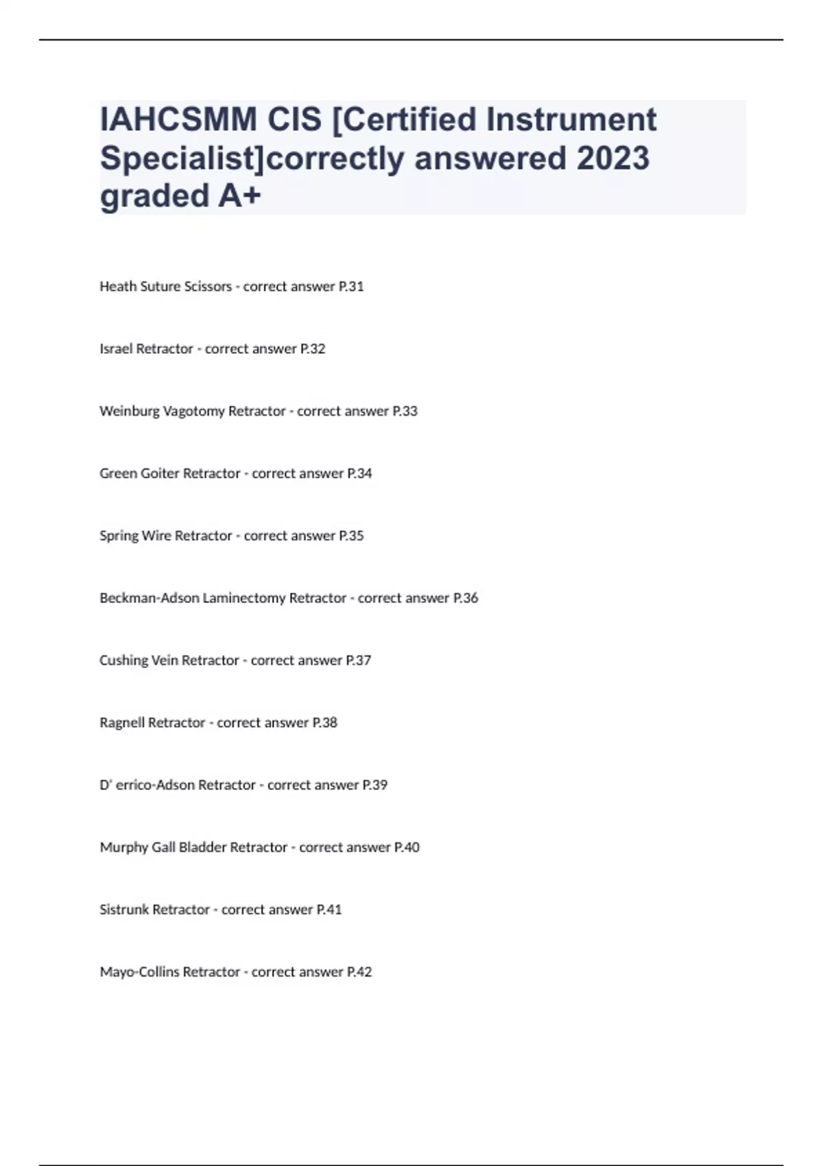 IAHCSMM CIS [Certified Instrument Specialist]correctly answered 2023 graded A+Heath Suture Scissors - correct answer P.31 Israel Retractor - correct answer P.32 Weinburg Vagotomy Retractor - correct answer P.33 Green Goiter Retractor - correct answer P.34 Spring Wire Retractor - correct answer P.35 Beckman-Adson Laminectomy Retractor - correct answer P.36 Cushing Vein Retractor - correct answer P.37 Ragnell Retractor - correct answer P.38 D' errico-Adson Retractor - correct answer P.39 Murphy Gall Bladder Retractor - correct answer P.40 Sistrunk Retractor - correct answer P.41 Mayo-Collins Retractor - correct answer P.42