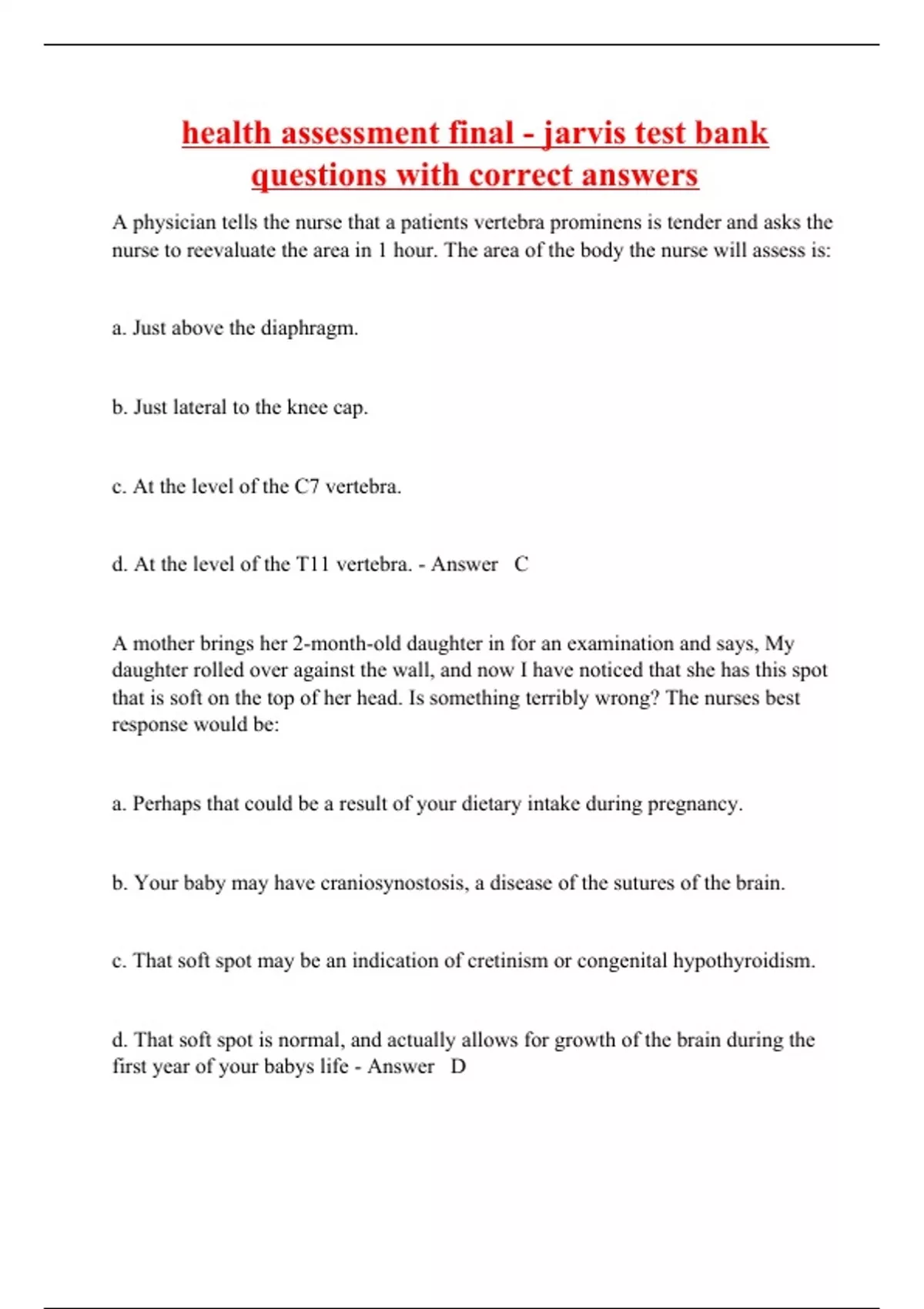 A physician tells the nurse that a patients vertebra prominens is tender and asks the nurse to reevaluate the area in 1 hour. The area of the body the nurse will assess is: a. Just above the diaphragm. b. Just lateral to the knee cap. c. At the level of the C7 vertebra. d. At the level of the T11 vertebra. - Answer C A mother brings her 2-month-old daughter in for an examination and says, My daughter rolled over against the wall, and now I have noticed that she has this spot that is soft on the top of her head. Is something terribly wrong? The nurses best response would be: a. Perhaps that could be a result of your dietary intake during pregnancy. b. Your baby may have craniosynostosis, a disease of the sutures of the brain. c. That soft spot may be an indication of cretinism or congenital hypothyroidism. d. That soft spot is normal, and actually allows for growth of the brain during the first year of your babys life - Answer D