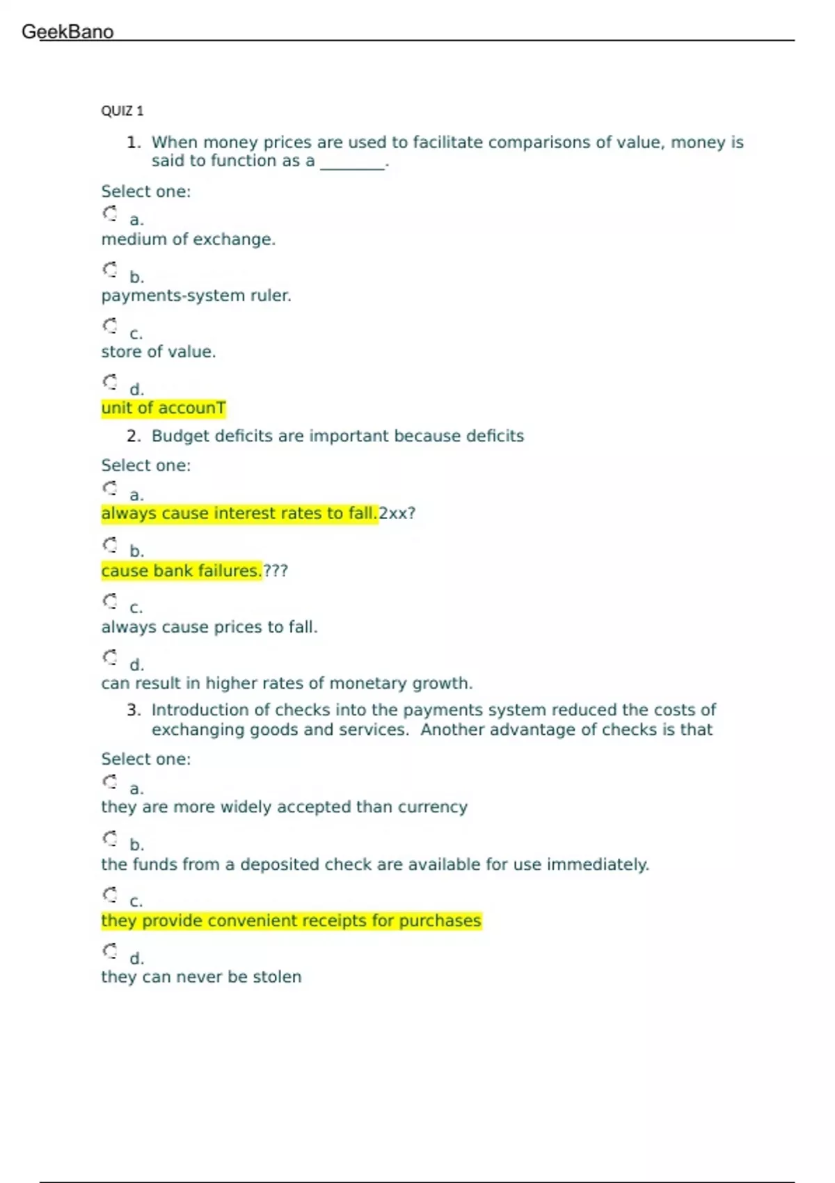 QUIZ 1 1. When money prices are used to facilitate comparisons of value, money is said to function as a ________. Select one: a. medium of exchange. b. payments-system ruler. c. store of value. d. unit of accounT 2. Budget deficits are important because deficits Select one: a. always cause interest rates to fall.2xx? b. cause bank failures.??? c. always cause prices to fall. d. can result in higher rates of monetary growth. 3. Introduction of checks into the payments system reduced the costs of exchanging goods and services. Another advantage of checks is that Select one: a. they are more widely accepted than currency b. the funds from a deposited check are available for use immediately. c. they provide convenient receipts for purchases d. they can never be stolen GeekBano 4. Money is Select one: a. anything that is generally accepted in payment for goods and services or in the repayment of debt. b. the total collection of pieces of property that are a store of value c. always based on a precious metal like gold or silver. d. a flow of earnings per unit of time. 5. Of moneyʹs three functions, the one that distinguishes money from other assets is its function as a _______. Select one: a. store of value b. unit of account. c. medium of exchange.???? d. standard of deferred payment 6. A disadvantage of ________ is that it is very heavy and hard to transport from one place to another. Select one: a. paper money b. electronic money c. commodity money/ d. fiat money GeekBano 7. Paper currency that has been declared legal tender but is not convertible into coins or precious metals is called ________ money. Select one: a.// fiat b. commodity c. funny d. electronic 8. Kevin purchasing concert tickets with his debit card is an example of the ________ function of money Select one: a. specialization b. medium of exchange2/ c. store of value1 d. unit of account 9. Currency includes Select one: a. paper money and checks b. paper money, coins, and checks c. paper money, coins, checks, and savings deposits. d. paper money and coins// 10. When tax revenues are greater than government expenditures, the government has a budget ________. GeekBano Select one: a. deficit b. revision c. Surplus/ d. crisis 11. Whatever a society uses as money, the distinguishing characteristic is that it must Select one: a. contain gold. b. be completely inflation proof. c. be produced by the government. d. be generally acceptable as payment for goods and services or in the repayment of debt. 12. If peanuts serve as a medium of exchange, a unit of account, and a store of value, then peanuts are Select one: a. reserves. b. loanable funds c. Money// d. bank deposits 13. Patrick places his pocket change into his savings bank on his desk each evening. By his actions, Patrick indicates that he believes that money is a GeekBano Select one: a. unit of specialization. b. store of value.// c. unit of account d. medium of exchange. 14. ________ policy involves decisions about government spending and taxation. Select one: a. Systemic b./ Fiscal c. Financial d. Monetary