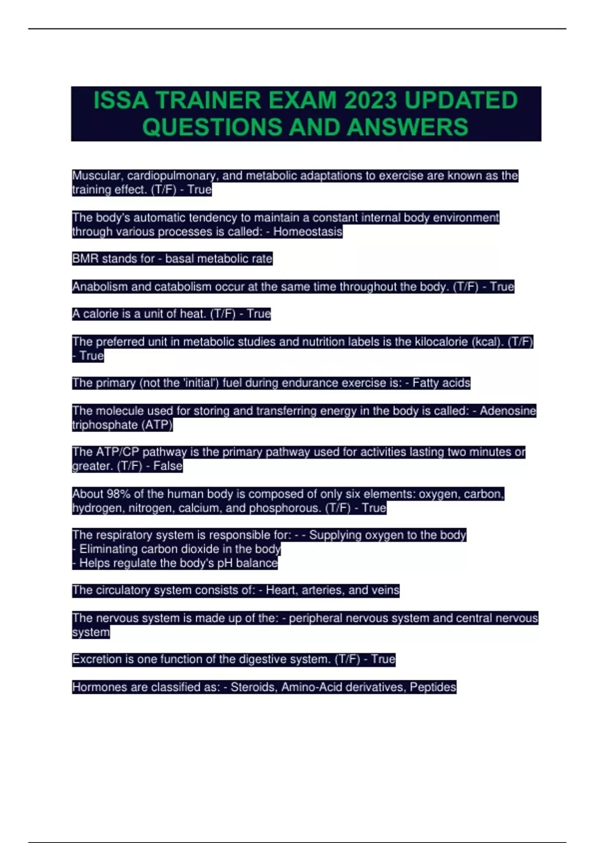 Muscular, cardiopulmonary, and metabolic adaptations to exercise are known as the training effect. (T/F) - True The body's automatic tendency to maintain a constant internal body environment through various processes is called: - Homeostasis BMR stands for - basal metabolic rate Anabolism and catabolism occur at the same time throughout the body. (T/F) - True A calorie is a unit of heat. (T/F) - True The preferred unit in metabolic studies and nutrition labels is the kilocalorie (kcal). (T/F) - True The primary (not the 'initial') fuel during endurance exercise is: - Fatty acids The molecule used for storing and transferring energy in the body is called: - Adenosine triphosphate (ATP) The ATP/CP pathway is the primary pathway used for activities lasting two minutes or greater. (T/F) - False About 98% of the human body is composed of only six elements: oxygen, carbon, hydrogen, nitrogen, calcium, and phosphorous. (T/F) - True The respiratory system is responsible for: - - Supplying oxygen to the body - Eliminating carbon dioxide in the body - Helps regulate the body's pH balance The circulatory system consists of: - Heart, arteries, and veins The nervous system is made up of the: - peripheral nervous system and central nervous system Excretion is one function of the digestive system. (T/F) - True Hormones are classified as: - Steroids, Amino-Acid derivatives, Peptides Hemoglobin is an oxygen-transporting protein in red blood cells. (T/F) - True The main purpose(s) of hormones is/are to: - - Alter the rate of synthesis of your cellular protein - Change the rate of enzyme activity - Change the rate of transport of nutrients through the cell wall Tendons connect bone to bone. (T/F) - False The average human adult skeleton has: - 206 bones Tendons: - Are extensions of muscle fibers and connect muscle to bone The anatomical terms for front and back are: - anterior and posterior Type I muscle fibers are predominantly aerobic. (T/F) - True Cardiovascular/aerobic exercise results in: - Mitochondrial adaptations Type II muscle fibers are entirely aerobic. (T/F) - False Muscular hypertrophy is a(n): - increase in muscle fiber size In a concentric contraction, the muscle lengthens to produce movements. (T/F) - False Kinesiology is: - The science or study of human movement, and the active and passive structures involved An isometric contraction is when: - A muscle does not lengthen or shorten as it contracts True synergy occurs when a muscle contracts to stop the secondary action of another muscle. (T/F) - True An example of an antagonist muscle is: - Triceps during a biceps curl Adduction is a movement of a body part away from the midline of the body. (T/F) - False An example of flexion is the: - Concentric action of a bicep curl Flexion mainly occurs in which plane? - sagittal plane Newton's second law of motion deals with force and its relationship to mass and acceleration. (T/F) - True Biomechanics is the study of: - movement Muscular force is broken down into the components of: - Magnitude, Direction, Point of application, Line of action Inertia can be categorized as: - Resting inertia and moving inertia A first-class lever is similar to a seesaw. (T/F) - True The ability to perceive your position and movement of the body or limbs in space is known as: - Kinesthesis A second-class lever is similar to a wheelbarrow. (T/F) - True The faster the work is done during a movement, the lesser the amount of power. (T/F) - False Posture is solely viewed in static positions, such as sitting, standing, or lying down. (T/F) - False "Flatback" can be identified by a: - Posterior pelvic tilt Excessive lateral curvature of the spinal column is known as: - Scoliosis Kyphosis is an exaggerated anterior-posterior curvature of the spinal column. (T/F) - True When the superior iliac crest of the pelvis moves forward and downward from the normal anatomical position, it is known as: - Lordosis Intradiscal pressure is up to 11 times greater when seated versus lying down. (T/F) - True Exaggerated anterior-posterior curvature of the spinal column is known as: - Kyphosis Even though sitting can be unavoidable for many people, it is best to limit time spent sitting as much as possible, and design your workplace according to correct ergonomics. (T/F) - True The major movements that are possible at the knee joint are adduction and abduction. (T/F) - False The knee is stabilized on the anterior side by which muscle? - Quadriceps The semimembranosus and semitendinosus attach on what side of the knee? - Medial The ankle joint is made up of which bone(s)? - tibia and talus