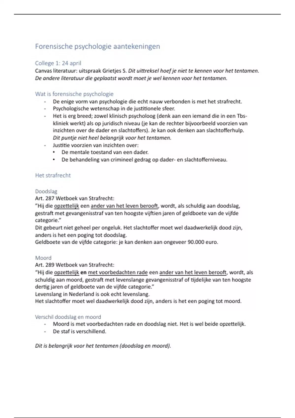 Dit is belangrijk voor het tentamen (doodslag en moord).