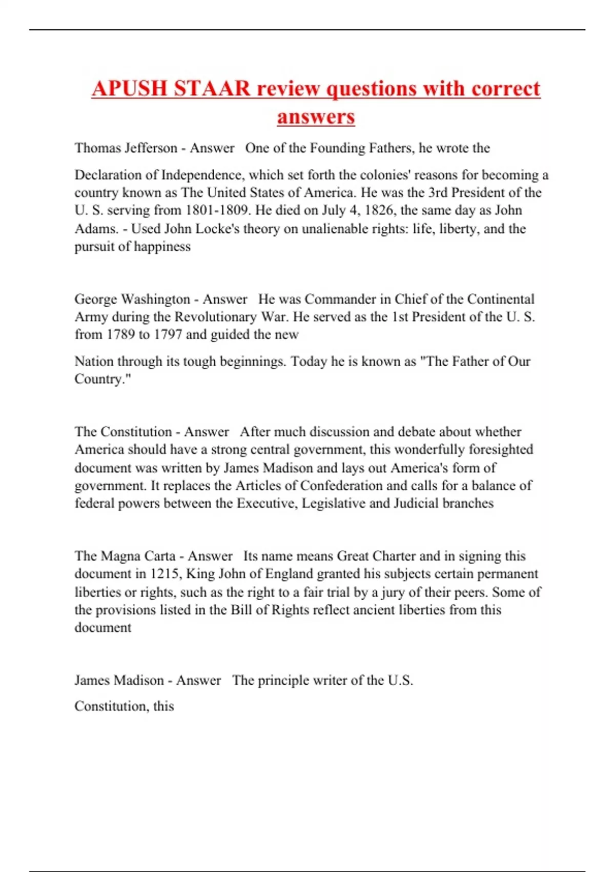 Thomas Jefferson - Answer One of the Founding Fathers, he wrote the Declaration of Independence, which set forth the colonies' reasons for becoming a country known as The United States of America. He was the 3rd President of the U. S. serving from . He died on July 4, 1826, the same day as John Adams. - Used John Locke's theory on unalienable rights: life, liberty, and the pursuit of happiness George Washington - Answer He was Commander in Chief of the Continental Army during the Revolutionary War. He served as the 1st President of the U. S. from 1789 to 1797 and guided the new Nation through its tough beginnings. Today he is known as "The Father of Our Country." The Constitution - Answer After much discussion and debate about whether America should have a strong central government, this wonderfully foresighted document was written by James Madison and lays out America's form of government. It replaces the Articles of Confederation and calls for a balance of federal powers between the Executive, Legislative and Judicial branches The Magna Carta - Answer Its name means Great Charter and in signing this document in 1215, King John of England granted his subjects certain permanent liberties or rights, such as the right to a fair trial by a jury of their peers. Some of the provisions listed in the Bill of Rights reflect ancient liberties from this document James Madison - Answer The principle writer of the U.S. Constitution, this