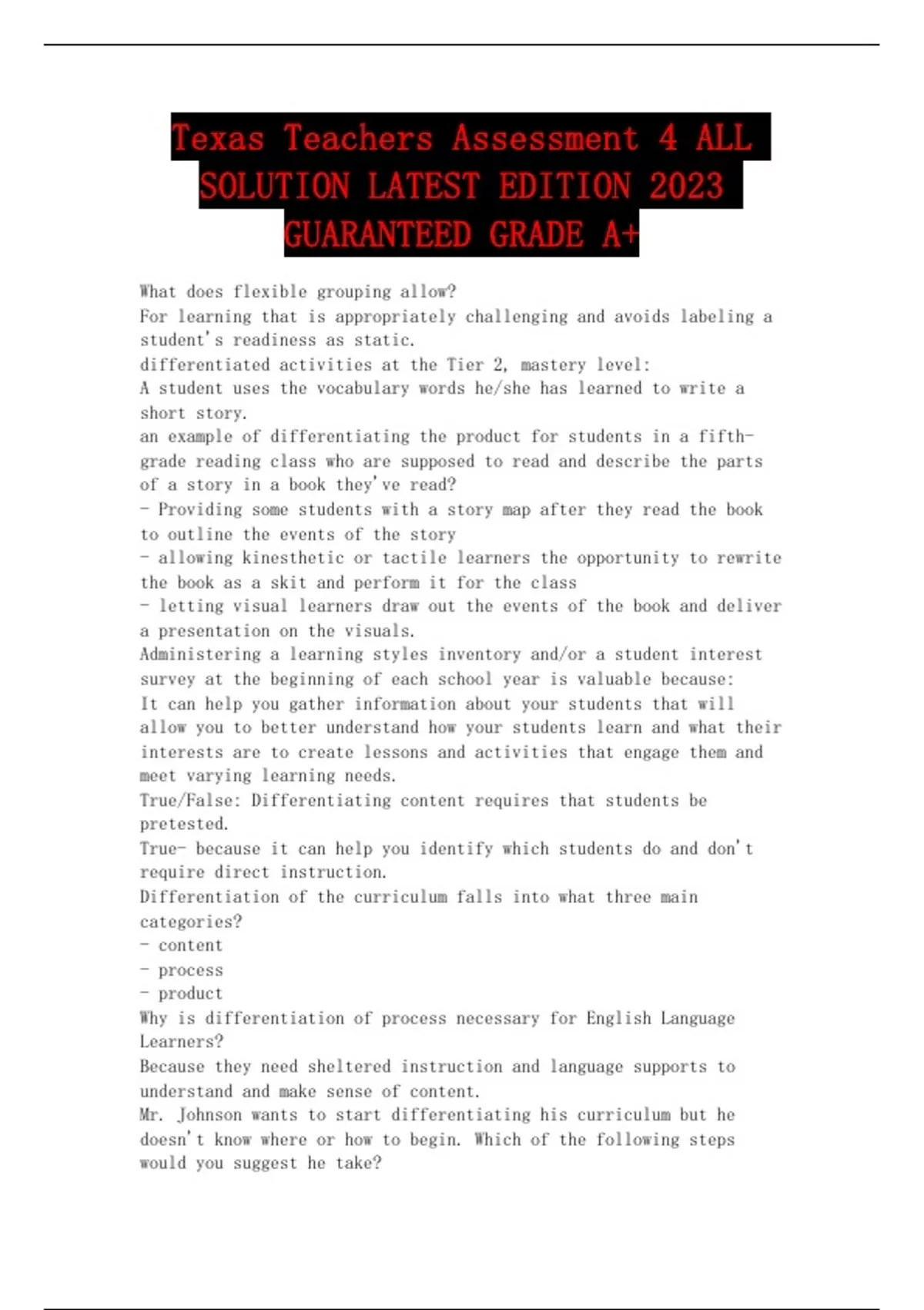 Texas Teachers Assessment 4 ALL SOLUTION LATEST EDITION 2023 GUARANTEED GRADE A+