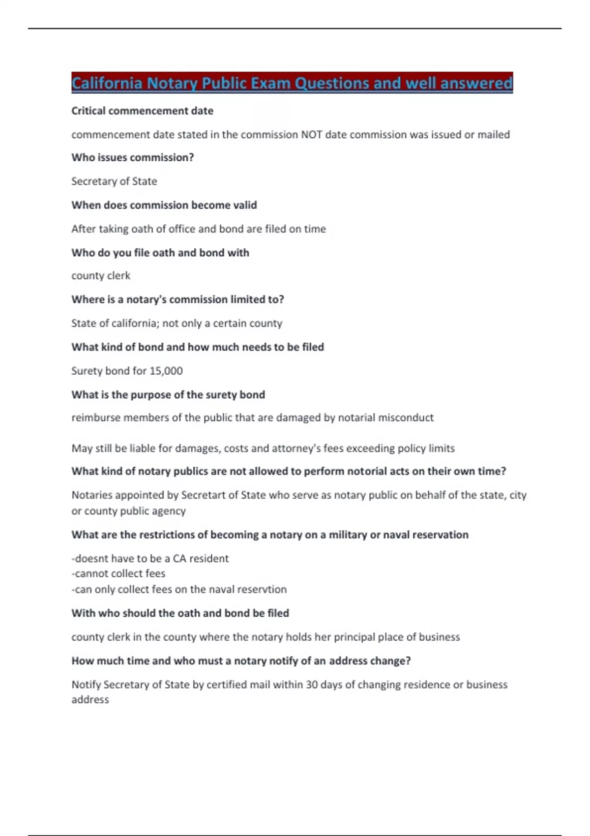 California Notary Public Exam Questions and well answered.