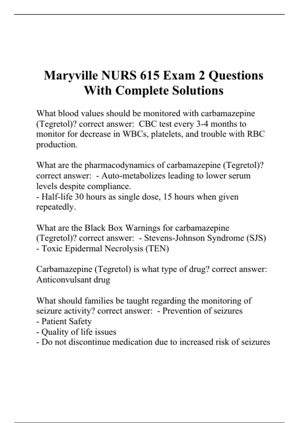 What blood values should be monitored with carbamazepine (Tegretol)? correct answer: CBC test every 3-4 months to monitor for decrease in WBCs, platelets, and trouble with RBC production. What are the pharmacodynamics of carbamazepine (Tegretol)? correct answer: - Auto-metabolizes leading to lower serum levels despite compliance. - Half-life 30 hours as single dose, 15 hours when given repeatedly. What are the Black Box Warnings for carbamazepine (Tegretol)? correct answer: - Stevens-Johnson Syndrome (SJS) - Toxic Epidermal Necrolysis (TEN) Carbamazepine (Tegretol) is what type of drug? correct answer: Anticonvulsant drug What should families be taught regarding the monitoring of seizure activity? correct answer: - Prevention of seizures - Patient Safety - Quality of life issues - Do not discontinue medication due to increased risk of seizures What electrolyte imbalance is noted with t