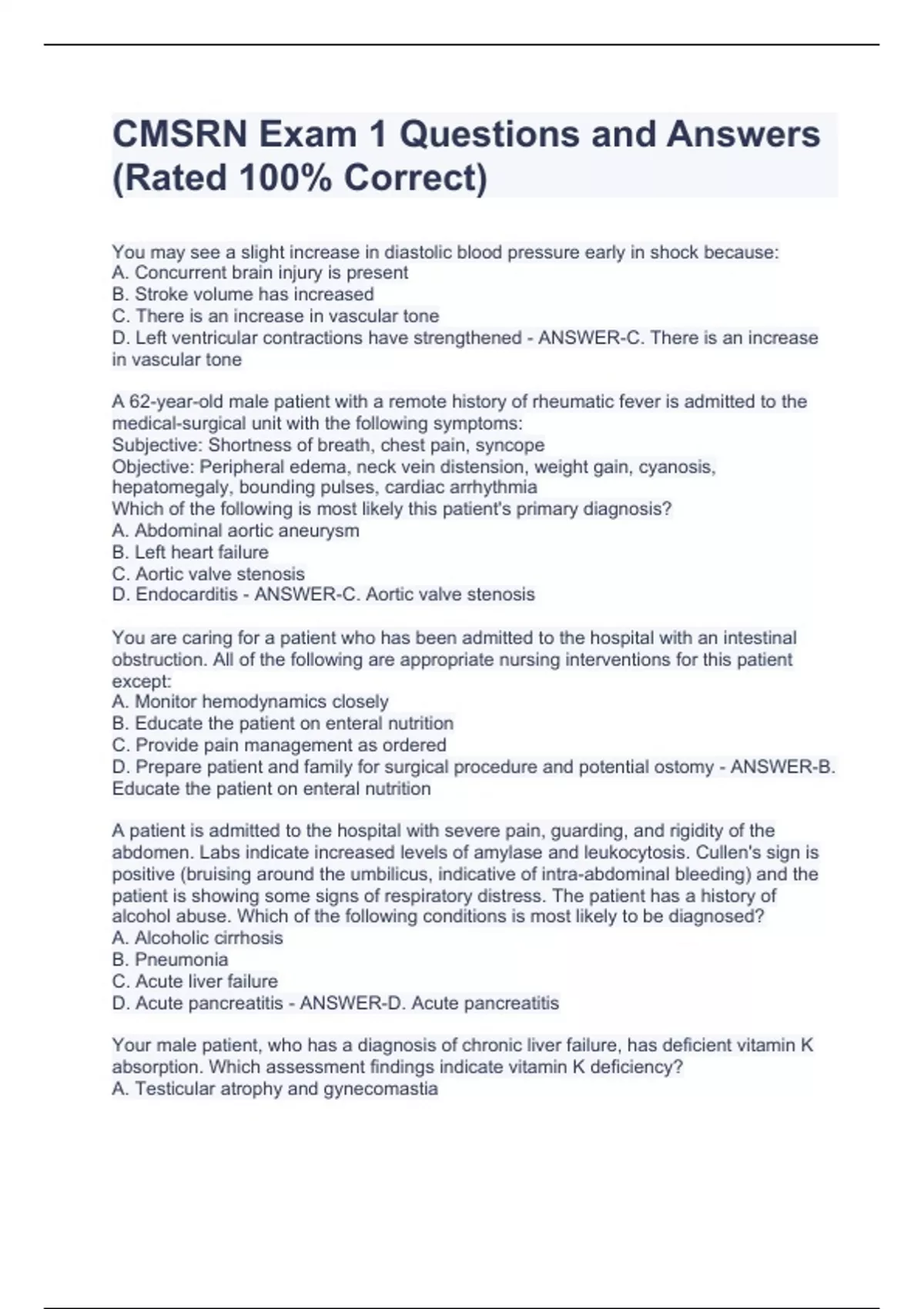 CMSRN Exam 1 Questions and Answers (Rated 100% Correct)CMSRN Exam 1 Questions and Answers (Rated 100% Correct)CMSRN Exam 1 Questions and Answers (Rated 100% Correct)CMSRN Exam 1 Questions and Answers (Rated 100% Correct)You may see a slight increase in diastolic blood pressure early in shock because: A. Concurrent brain injury is present B. Stroke volume has increased C. There is an increase in vascular tone D. Left ventricular contractions have strengthened - ANSWER-C. There is an increase in vascular tone A 62-year-old male patient with a remote history of rheumatic fever is admitted to the medical-surgical unit with the following symptoms: Subjective: Shortness of breath, chest pain, syncope Objective: Peripheral edema, neck vein distension, weight gain, cyanosis, hepatomegaly, bounding pulses, cardiac arrhythmia Which of the following is most likely this patient's primary diagnosis? A. Abdominal aortic aneurysm B. Left heart failure C. Aortic valve stenosis D. Endocarditis - ANSWER-C. Aortic valve stenosis You are caring for a patient who has been admitted to the hospital with an intestinal obstruction. All of the following are appropriate nursing interventions for this patient except: A. Monitor hemodynamics closely B. Educate the patient on enteral nutrition C. Provide pain management as ordered D. Prepare patient and family for surgical procedure and potential ostomy - ANSWER-B. Educate the patient on enteral nutrition A patient is admitted to the hospital with severe pain, guarding, and rigidity of the abdomen. Labs indicate increased levels of amylase and leukocytosis. Cullen's sign is positive (bruising around the umbilicus, indicative of intra-abdominal bleeding) and the patient is showing some signs of respiratory distress. The patient has a history of alcohol abuse. Which of the following conditions is most likely to be diagnosed?