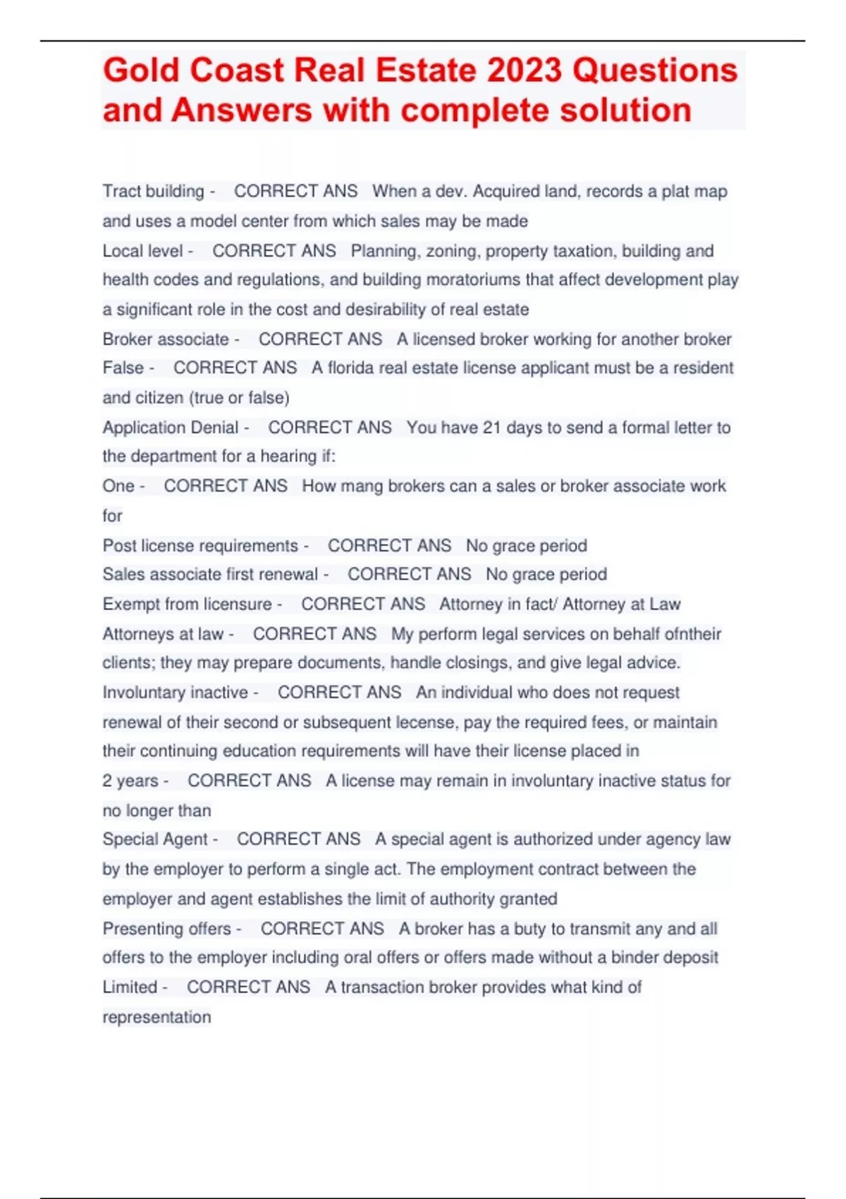 Tract building - CORRECT ANS When a dev. Acquired land, records a plat map and uses a model center from which sales may be made Local level - CORRECT ANS Planning, zoning, property taxation, building and health codes and regulations, and building moratoriums that affect development play a significant role in the cost and desirability of real estate Broker associate - CORRECT ANS A licensed broker working for another broker False - CORRECT ANS A florida real estate license applicant must be a resident and citizen (true or false) Application Denial - CORRECT ANS You have 21 days to send a formal letter to the department for a hearing if: One - CORRECT ANS How mang brokers can a sales or broker associate work for Post license requirements - CORRECT ANS No grace period Sales associate first renewal - CORRECT ANS No grace period Exempt from licensure - CORRECT ANS Attorney in fact/ Attorney at Law Attorneys at law - CORRECT ANS My perform legal services on behalf ofntheir clients; they may prepare documents, handle closings, and give legal advice. Involuntary inactive - CORRECT ANS An individual who does not request renewal of their second or subsequent lecense, pay the required fees, or maintain their continuing education requirements will have their license placed in 2 years - CORRECT ANS A license may remain in involuntary inactive status for no longer than Special Agent - CORRECT ANS A special agent is authorized under agency law by the employer to perform a single act. The employment contract between the employer and agent establishes the limit of authority granted Presenting offers - CORRECT ANS A broker has a buty to transmit any and all offers to the employer including oral offers or offers made without a binder deposit Limited - CORRECT ANS A transaction broker provides what kind of representation