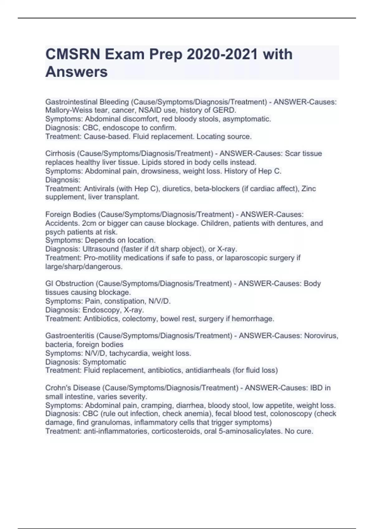 CMSRN Exam Prep with AnswersCMSRN Exam Prep with AnswersCMSRN Exam Prep with AnswersCMSRN Exam Prep with AnswersCMSRN Exam Prep with Answers Gastrointestinal Bleeding (Cause/Symptoms/Diagnosis/Treatment) - ANSWER-Causes: Mallory-Weiss tear, cancer, NSAID use, history of GERD. Symptoms: Abdominal discomfort, red bloody stools, asymptomatic. Diagnosis: CBC, endoscope to confirm. Treatment: Cause-based. Fluid replacement. Locating source. Cirrhosis (Cause/Symptoms/Diagnosis/Treatment) - ANSWER-Causes: Scar tissue replaces healthy liver tissue. Lipids stored in body cells instead. Symptoms: Abdominal pain, drowsiness, weight loss. History of Hep C. Diagnosis: Treatment: Antivirals (with Hep C), diuretics, beta-blockers (if cardiac affect), Zinc supplement, liver transplant. Foreign Bodies (Cause/Symptoms/Diagnosis/Treatment) - ANSWER-Causes: Accidents. 2cm or bigger can cause blockage. Children, patients with dentures, and psych patients at risk. Symptoms: Depends on location. Diagnosis: Ultrasound (faster if d/t sharp object), or X-ray. Treatment: Pro-motility medications if safe to pass, or laparoscopic surgery if