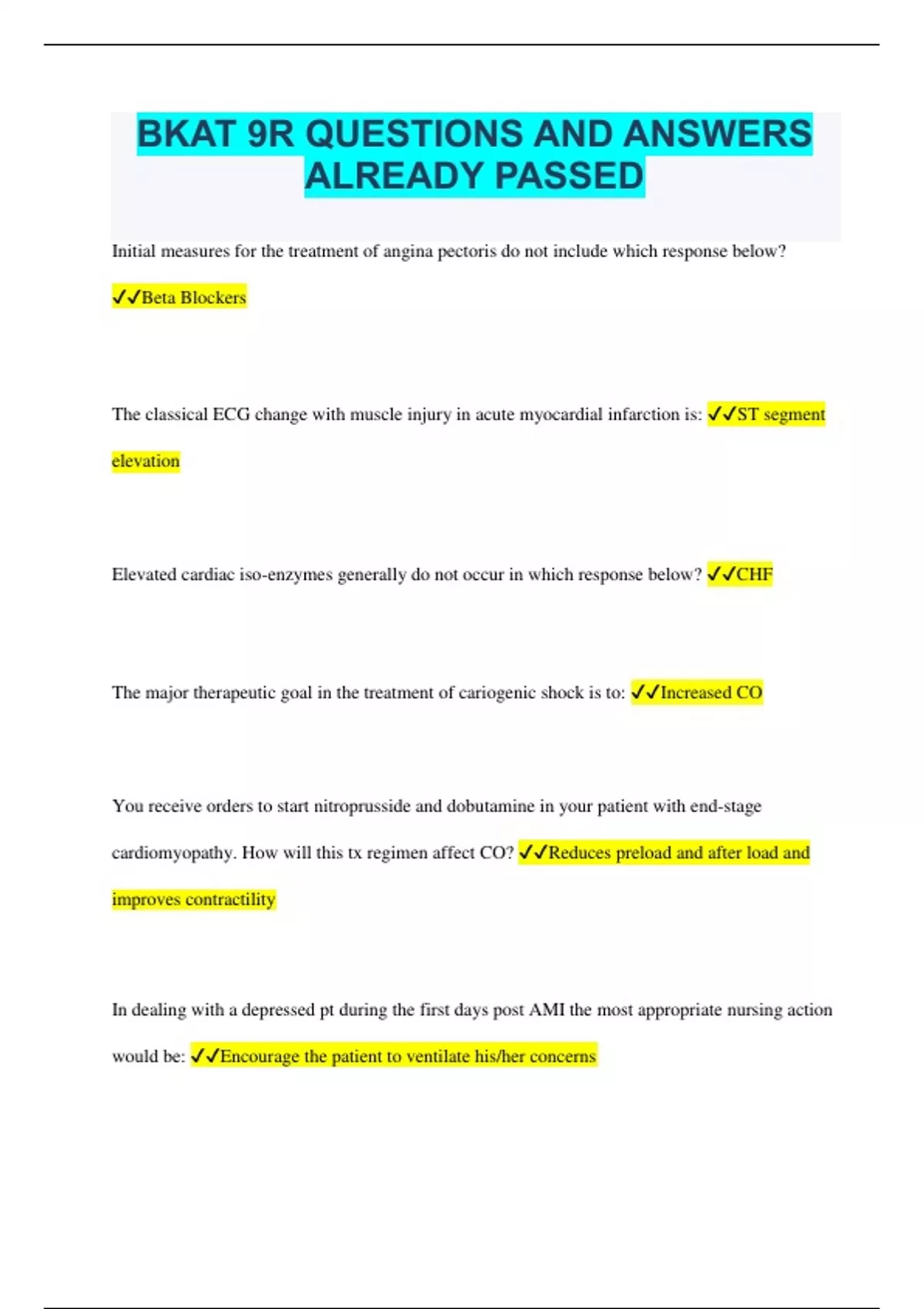 BKAT 9R QUESTIONS AND ANSWERS ALREADY PASSED Initial measures for the treatment of angina pectoris do not include which response below? Beta Blockers The classical ECG change with muscle injury in acute myocardial infarction is: ST segment elevation Elevated cardiac iso-enzymes generally do not occur in which response below? CHF The major therapeutic goal in the treatment of cariogenic shock is to: Increased CO You receive orders to start nitroprusside and dobutamine in your patient with end-stage cardiomyopathy. How will this tx regimen affect CO? Reduces preload and after load and improves contractility In dealing with a depressed pt during the first days post AMI the most appropriate nursing action would be: Encourage the patient to ventilate his/her concerns Mr Seamore is receiving thrombolytics (TPA) 3 hrs after an AMI. Which of the following would most likely require discontinuing the infusion? change in mental status The following monitor pattern would indicate that the pulmonary artery (swan ganz) catheter is in which position? Pulmonary artery occlusion (wedge) A systolic murmur that is auscultated at the 2nd intercostal space, right sternal border is called: Aortic stenosis Which of the following wave patterns indicates proper functioning of an arterial line? High to low After an arterial catheter is removed, direct pressure should be applied to the artery for how long? 8-10 minutes A CVP reading directly reflects pressure in the: Right atrium An elevated CVP reading may indicate: Rt heart failure The pulmonary artery occlusive (wedge) pressure (PAOP) reflects pressure in the: Lt ventricle The normal pulmonary artery pressure is: 11-20 How many mmHg is the normal PAOP? 6-12 An elevated PAOP may indicate: Lt ventricular failure Mr Adams, a 68 yo pt, c/o feeling "a little funny in his chest". His ECG shows Afib/flutter. Which of the following meds could be used to tx his cardiac rhythm? Diltiazem A QRS complex wider that .12 sec most likely indicates: BBB Special care should be exercised when administering IV Dopamine because Infiltration leads to tissue necrosis A strong ventricular stimulus is potentially dangerous when it lands on the: T wave indication for use of external cardiac pacemaker includes symptomatic complete heart block Initial drug tx for sustained V tach when a pulse is present Amiodorone 150mg IV over 10 min The cardiac rhythm of A flutter is: Hazardous, as the ventricular rate may suddenly increase Upon recognizing V fib in an ICU, the next thing the nurse should do is: Establish Unresponsiveness The tx in an emergency situation for complete heart block is: Preparing for transcutaneous pacing Your pt has A flutter with a ventricular response of 150 bpm, therapy for this rhythm includes: Amiodarone, Cardizem, Cardioversion Signs of cardiac tamponade do not include which response below? Bradycardia In the pt with V fib, the correct energy setting for the first defibrillation when using a biphasic defibrillator is how many joules? 150 A pt becomes apnea and pulseless. The monitor shows systole. The drug that would most likely be used initially is: Epinephrine Antidote for Heparin Protamine sulfate Most important step in preventing central venous catheter related sepsis is: Thorough handwashing An excessive amount of chest tube drainage in the first few hrs following thoracic surgery is how many mL's/hr? 150 A routine check of your patient's blood gas values show a pH of 7.40, pO2 of 98 mmHg, pCO2 of 38 mmHg, and HCO3 25 mEq. These results reflect: Normal values Before suctioning a pt, you adjust the vacuum pressure so that it is: 120 mmHg of pressure Post op pt has a left anterior chest tube. When you auscultate the lung fields bilaterally, you hear diminished breath sounds in the right posterior bases. This would most likely be due to: Atelectasis Your pt is on a ventilator. The low volume alarm sounds. This may be due to: Disconnected tubing To assess for proper positioning of an endotracheal tube, the most appropriate nursing action would be to: Listen for bilateral breath sounds Mr Ray has an endotracheal tube. While you are making rounds, you ask his breathing is okay. In an audible tone, he says 'yes'. You should first: Check the functioning of the cuff The high pressure alarm on a volume respirator will not be triggered by which response below? Leaking cuff The most important reason for diminishing breath sounds in a MVC victim with closed chest trauma is: Development of a pneumothorax A moderately burned trauma pt is admitted to your unit. The most important tx related to the burns during the first 24 hrs after injury is: Fluid replacement Your trauma pt, who is 4 days post fracture of the right femur, suddenly develops SOB. The most likely cause is: Fat embolus To help prevent VAP, the most important nursing action would be to: Careful hand washing and use of gloves when suctioning The most important nursing activity for a pt admitted with the diagnosis of cervical spinal cord injury is: Immobilizing the head In a pt with cervical spine injury, the most important observations the nurse makes concerns which of the following physiological parameters? Respirations The earliest sign of increased ICP generally involves changes in: LOC Deepening ICP is characterized by: Widened pulse pressure Drug of choice used to reduce increased ICP is: Mannitol A positive Babinski response in an adult: Indicates an abnormal finding Nursing care of a pt during the acute phase of a stroke does not include which response blow? Initiating t-PA, if within first 8 hrs post stroke Most important part of neuro check is? Evaluating the LOC S/S of DKA Fruity breath, deep and rapid breathing Hypoglycemia should be suspected when the diabetic pt c/o or manifests: Weakness, HA, diaphoresis Measures that would be taken to tx a pt in DKA coma would not include which response below? Dextrose 50% IV infusion Pt's with DM who are acutely ill generally require a: Higher dose of insulin Psycho