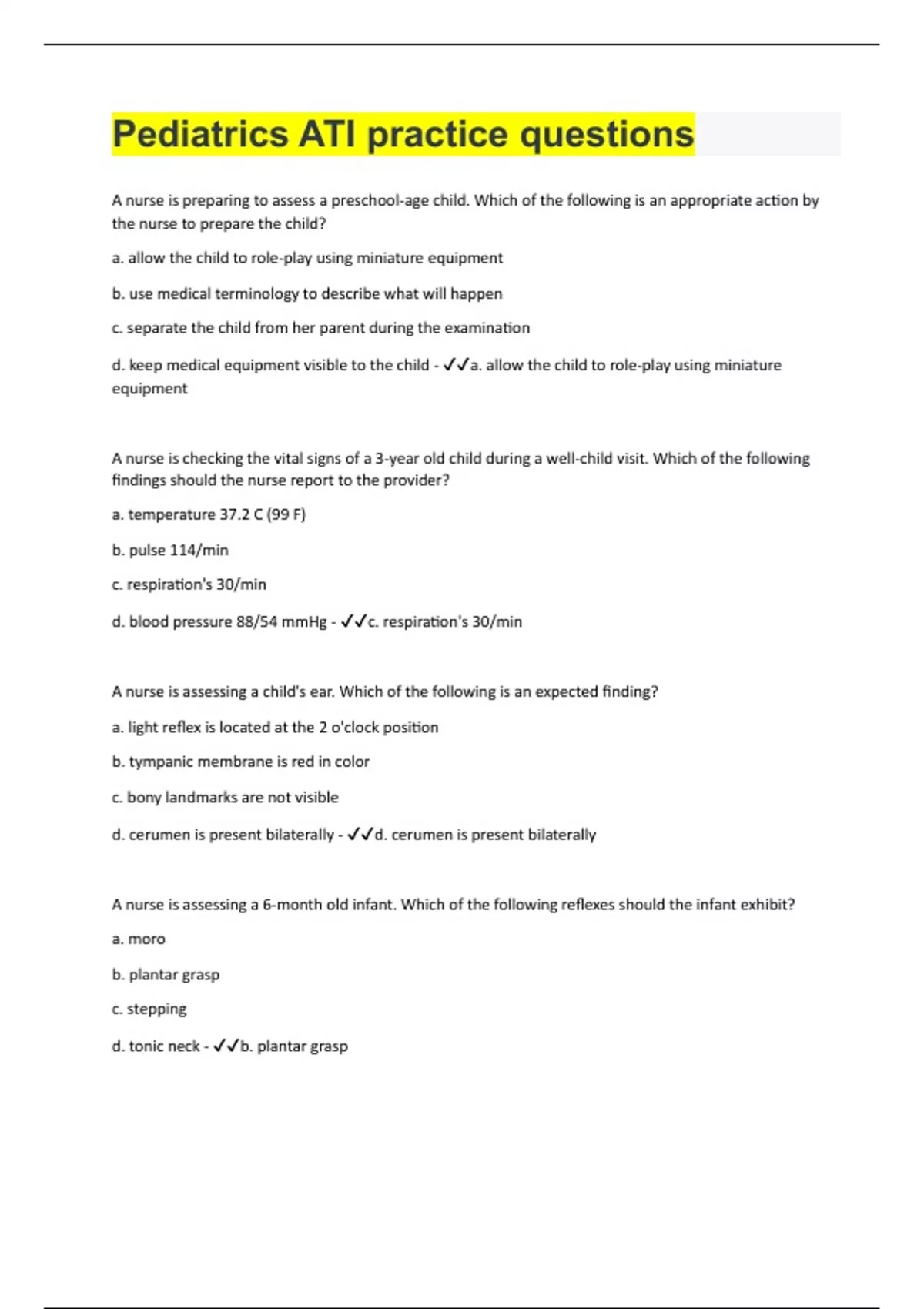 A nurse is preparing to assess a preschool-age child. Which of the following is an appropriate action by the nurse to prepare the child? a. allow the child to role-play using miniature equipment b. use medical terminology to describe what will happen c. separate the child from her parent during the examination d. keep medical equipment visible to the child - a. allow the child to role-play using miniature equipment A nurse is checking the vital signs of a 3-year old child during a well-child visit. Which of the following findings should the nurse report to the provider? a. temperature 37.2 C (99 F) b. pulse 114/min c. respiration's 30/min d. blood pressure 88/54 mmHg - c. respiration's 30/min A nurse is assessing a child's ear. Which of the following is an expected finding? a. light reflex is located at the 2 o'clock position b. tympanic membrane is red in color c. bony landmarks are not visible d. cerumen is present bilaterally - d. cerumen is present bilaterally A nurse is assessing a 6-month old infant. Which of the following reflexes should the infant exhibit? a. moro b. plantar grasp c. stepping d. tonic neck - b. plantar grasp